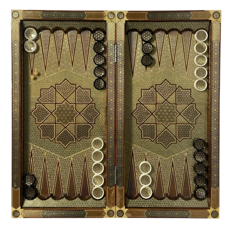 در بخش داخلی تخته، نقوش هندسی و ستارهای با نظم چشمگیر و رنگبندی طلایی، قهوهای و کرم جلوهای اصیل و سلطنتی ایجاد کردهاند. در سمت دیگر، صفحهی شطرنج با همان هماهنگی رنگ و خاتمکاری زیبا کار شده است تا هر دو بازی، با جلوهای هنرمندانه در کنار هم قرار گیرند.