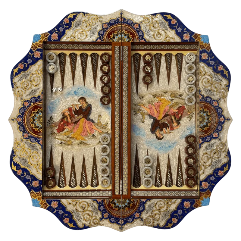 پشت تخته نیز به زیبایی تمام با نقاشی بزم ایرانی تزئین شده؛ جشنی پر از رنگ، شادی و ظرافت که در اطراف صفحهی شطرنج خاتمکاریشده جان گرفته است.