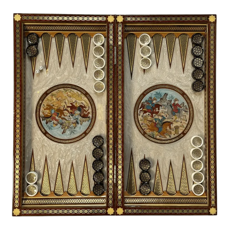 درون صفحهی تخته نرد، صحنههایی پرتحرک و زیبا از چوگان و شکار ترسیم شده است؛ نقاشیهایی که از نگارگری ایرانی الهام گرفتهاند و روایتگر شکوه سواران پارسی و روح سلحشوری ایرانزمین هستند. در بخش نخست، گروهی از سواران در میدان چوگان، با چابکی و مهارت در حال بازی و تاختوتازند، و در سوی دیگر، صحنهای از شکار با اسب و نیزه تصویر شده است که حرکت، هیجان و شکوه را به بهترین شکل بازتاب میدهد. هر دو نقاشی با رنگبندی متنوع و ترکیب چشمنوازی از طلایی، آبی، قرمز و قهوهای اجرا شدهاند تا عمق و زندهبودن اثر بیشتر احساس شود.