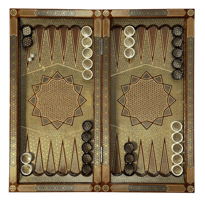 در بخش داخلی تخته، نقوش هندسی و ستارهای با نظم چشمگیر و رنگبندی طلایی، قهوهای و کرم جلوهای اصیل و سلطنتی ایجاد کردهاند. در سمت دیگر، صفحهی شطرنج با همان هماهنگی رنگ و خاتمکاری زیبا کار شده است تا هر دو بازی، با جلوهای هنرمندانه در کنار هم قرار گیرند.