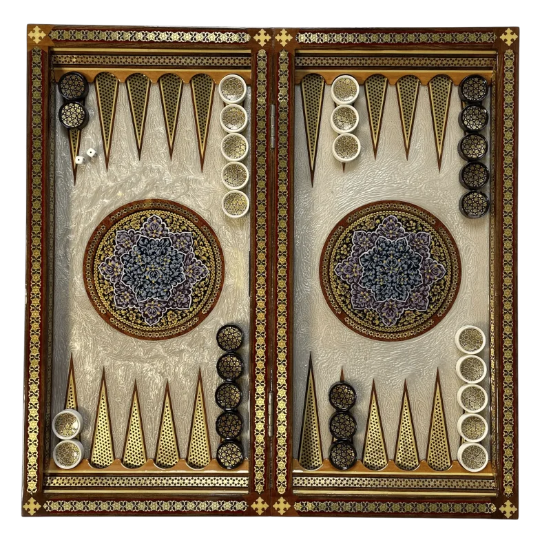 تختهنرد و شطرنج دوبازی نگین شرق، نمونهای فاخر و هنری از هنر اصیل ایرانی است که با ترکیبی از خاتمکاری دقیق، تذهیب ظریف و نقاشی پرداز جلوهای باشکوه و منحصربهفرد ارائه میدهد. این تخته با طراحی دایرهای و قاب سفید صدفی، جلوهای لوکس و فاخر داشته و هر نگاه را به خود جلب میکند.