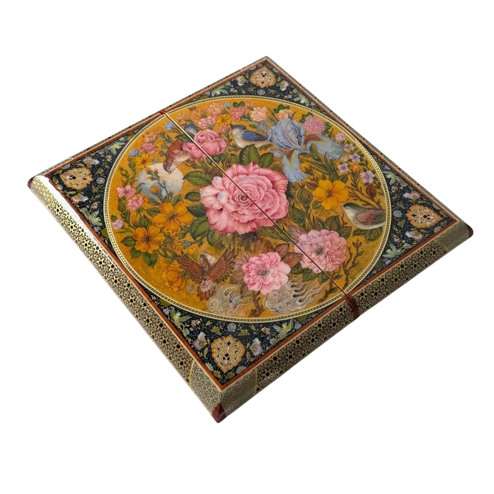فضای داخلی تخته نرد با زمینه‌ای مشکی پوشیده شده که تضاد چشم‌نوازی با طرح‌های گل و مرغ ایجاد کرده است. این طرح‌ها با الهام از نقاشی‌های مینیاتوری ایرانی، با تنوع بالای رنگ‌ها مانند آبی، سرخابی، زرد، سبز و طلایی، جلوه‌ای زنده، پرانرژی و اصیل به داخل تخته بخشیده‌اند.