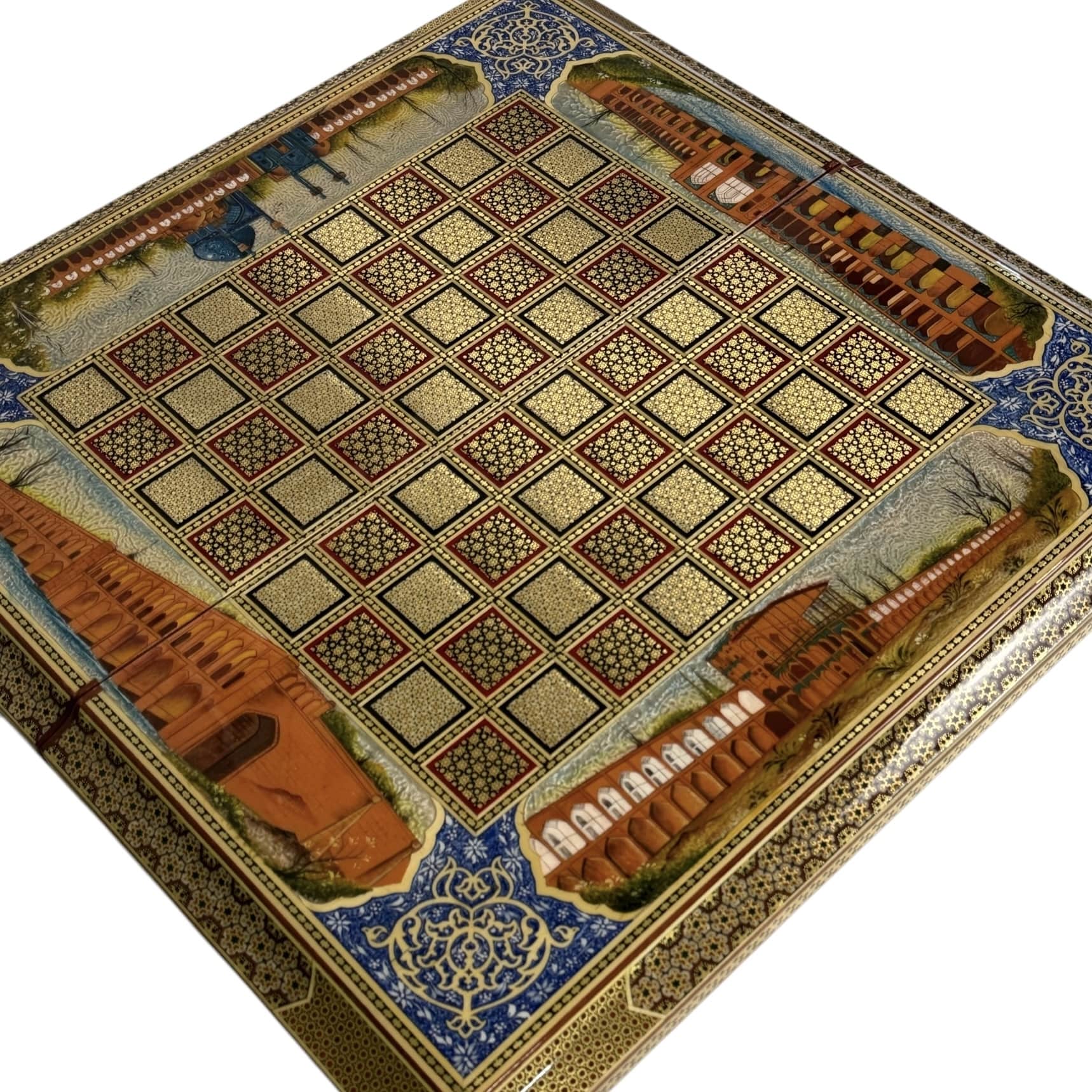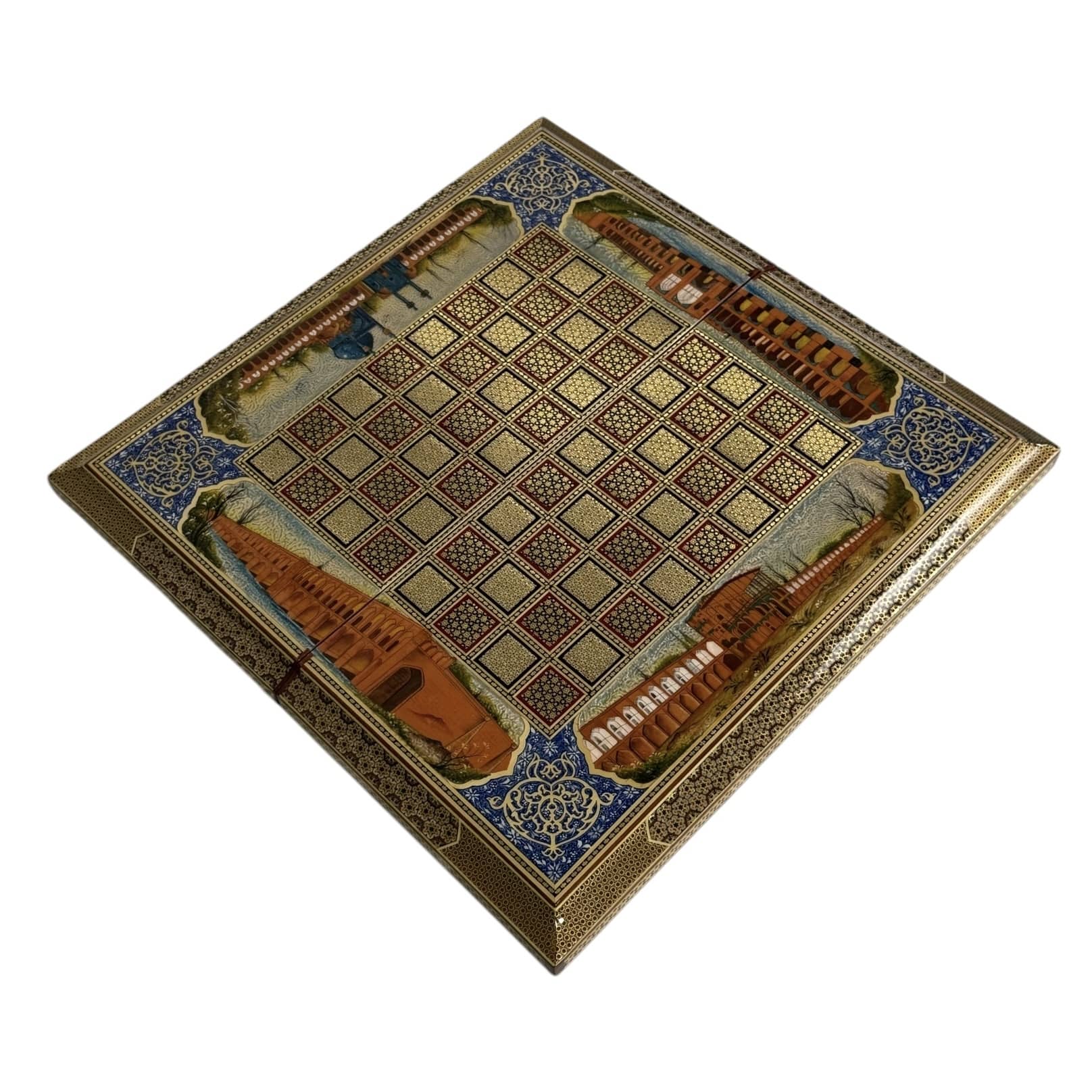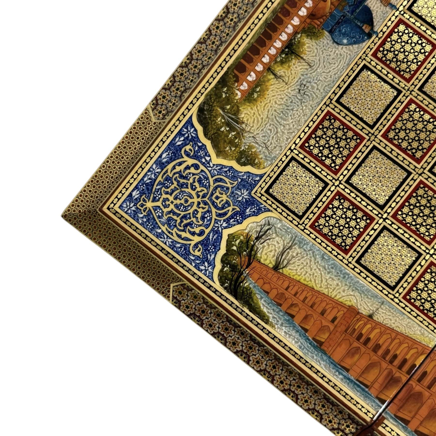 - دور تا دور صفحه شطرنج نقاشی زیبای سیوسهپل با جزئیات هنری کشیده شده است که اصالت و هنر ایرانی را به نمایش میگذارد.