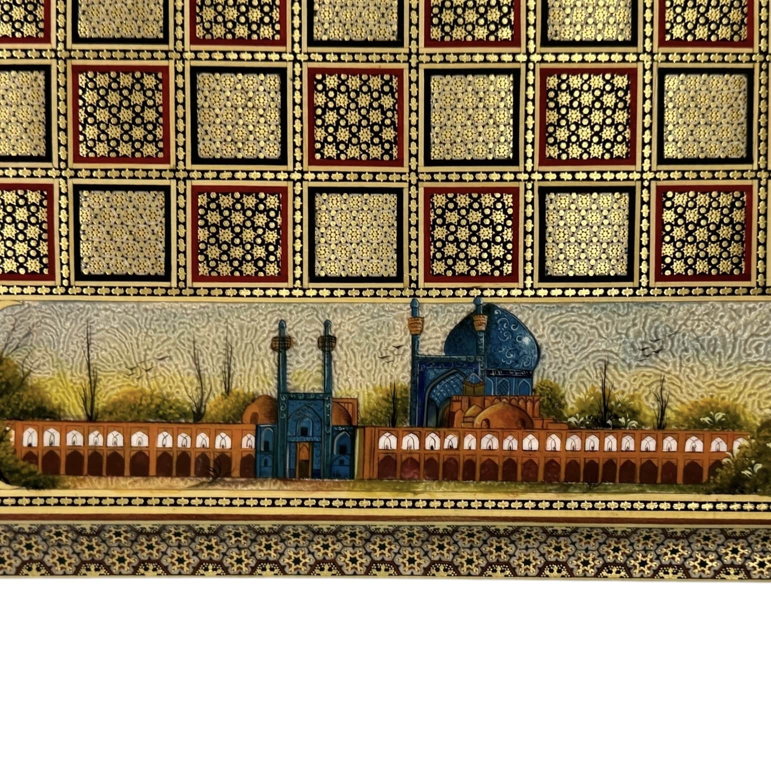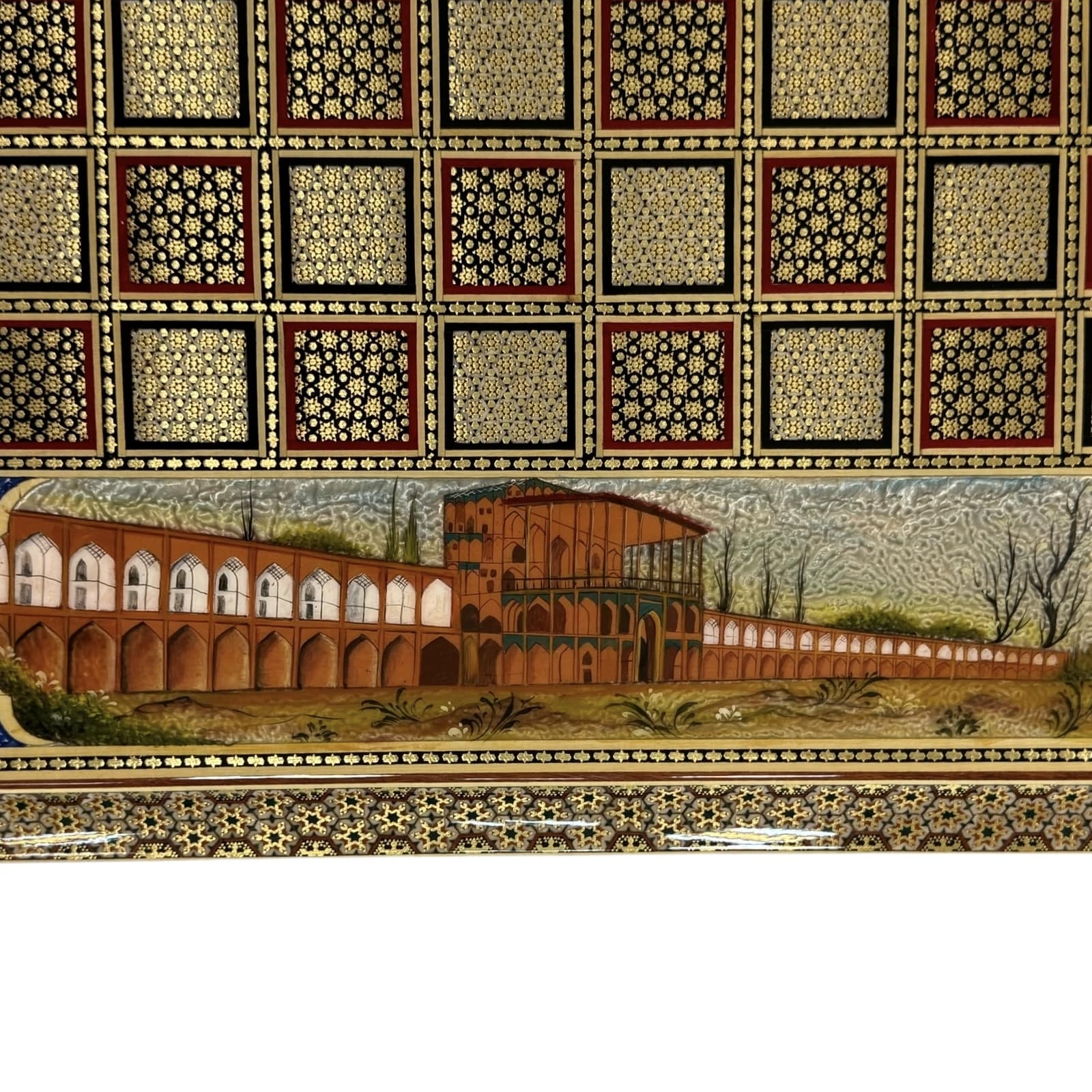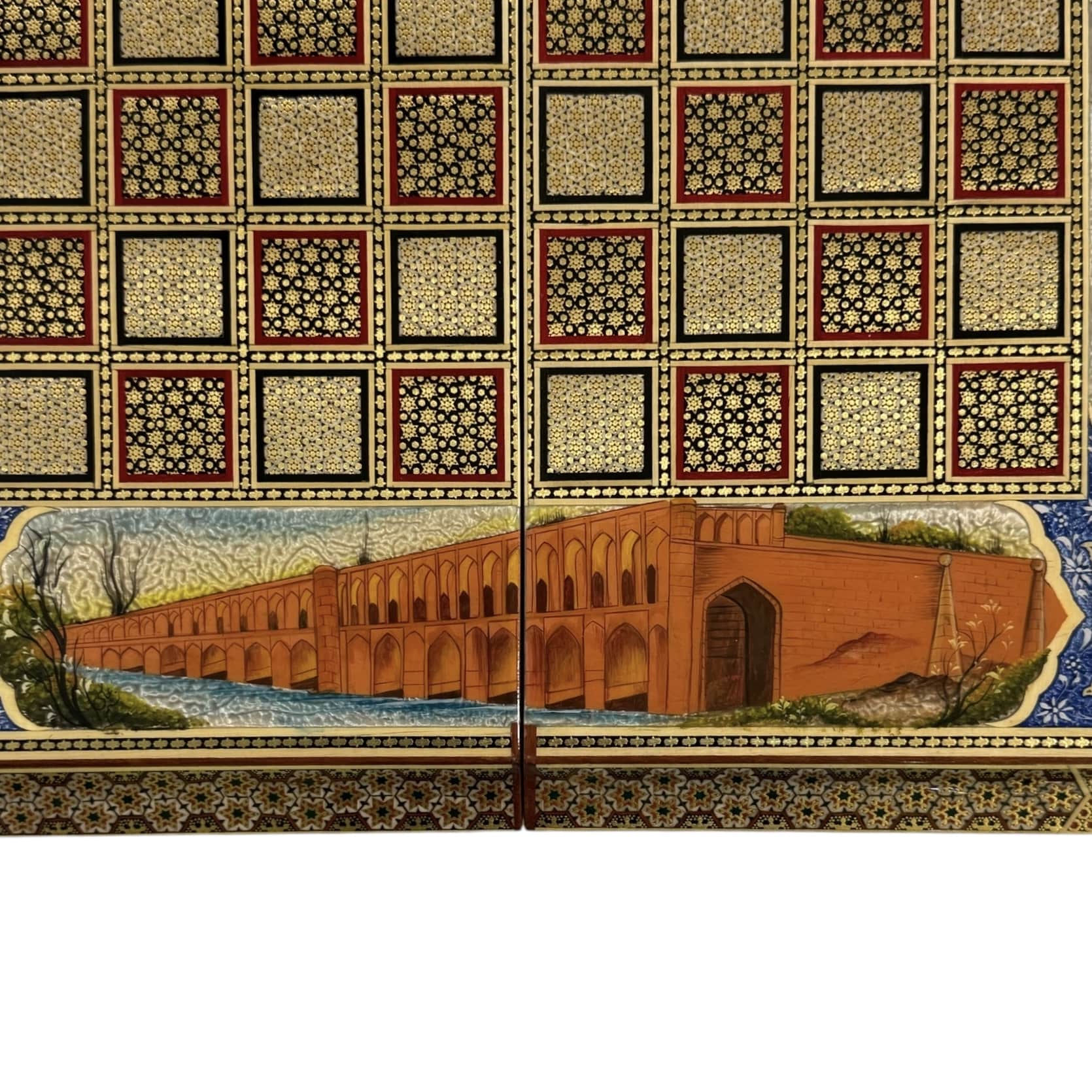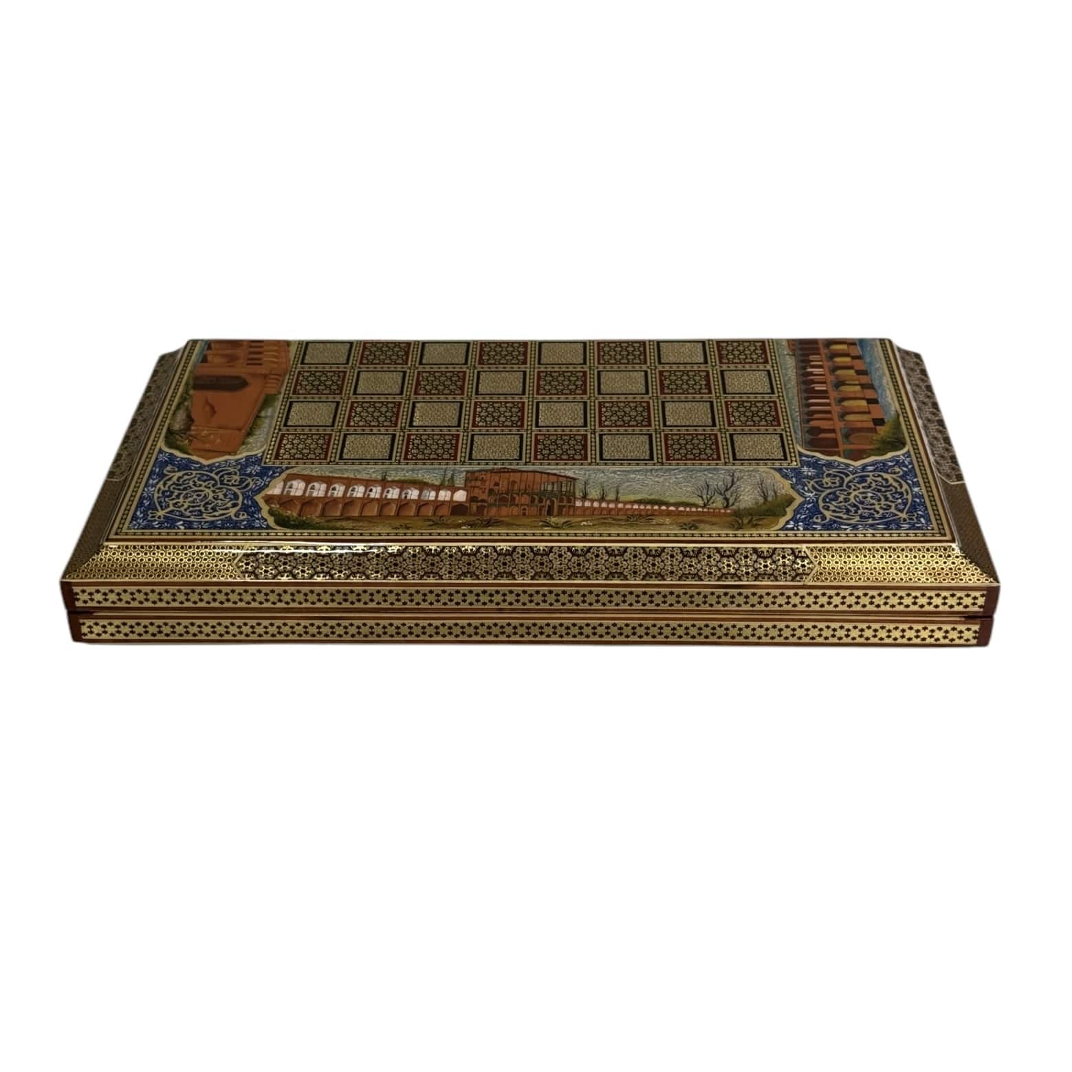 - دور تا دور صفحه شطرنج نقاشی زیبای سیوسهپل با جزئیات هنری کشیده شده است که اصالت و هنر ایرانی را به نمایش میگذارد.