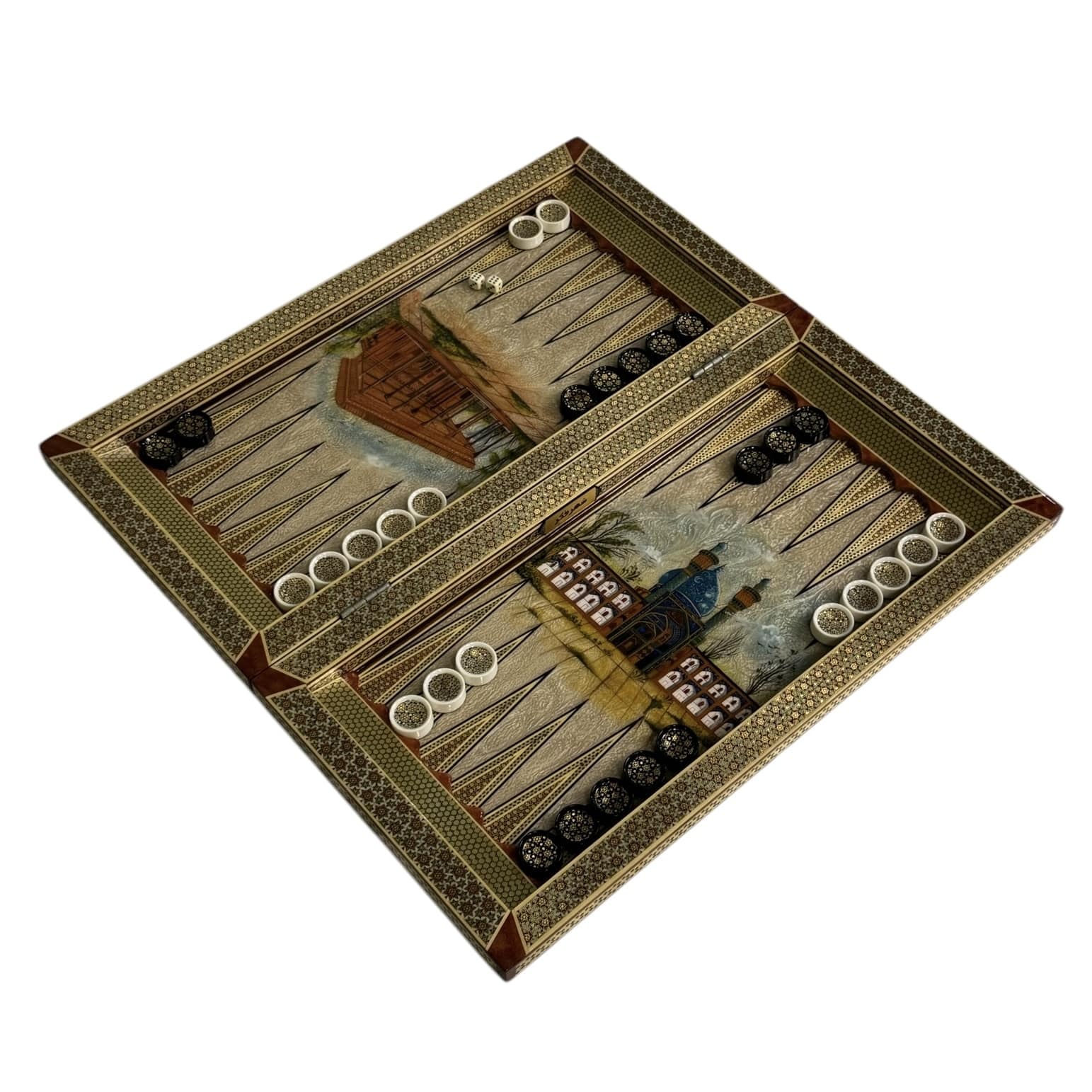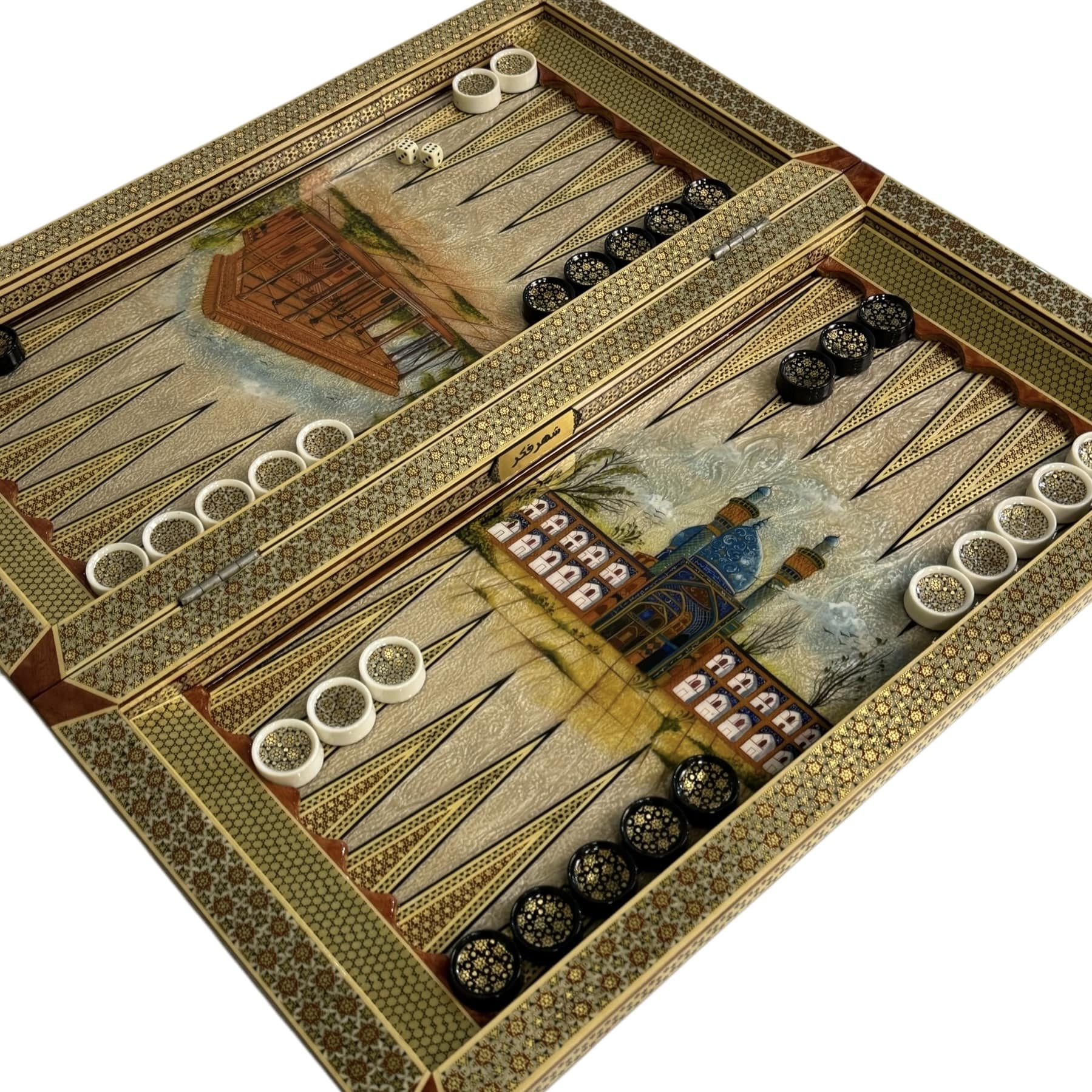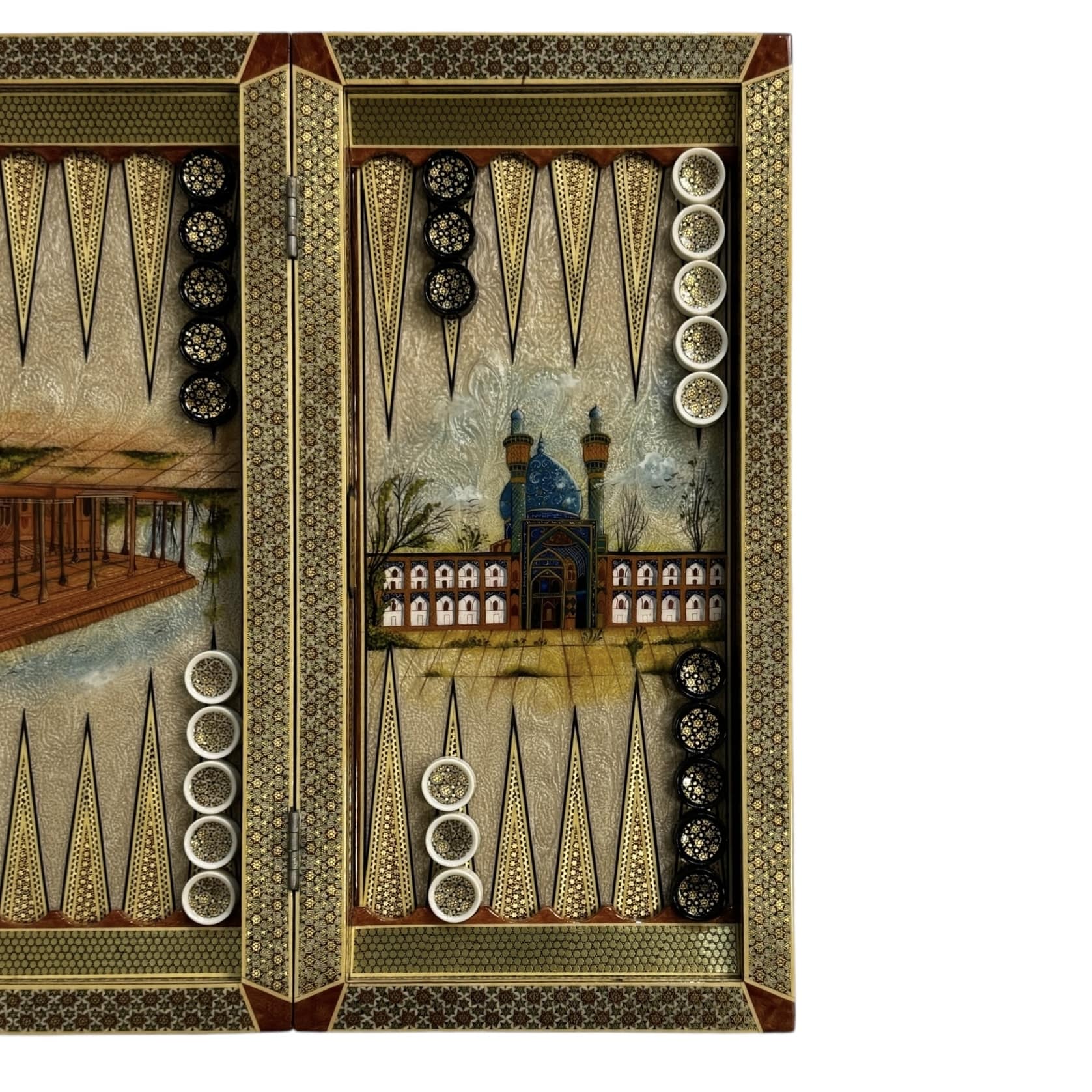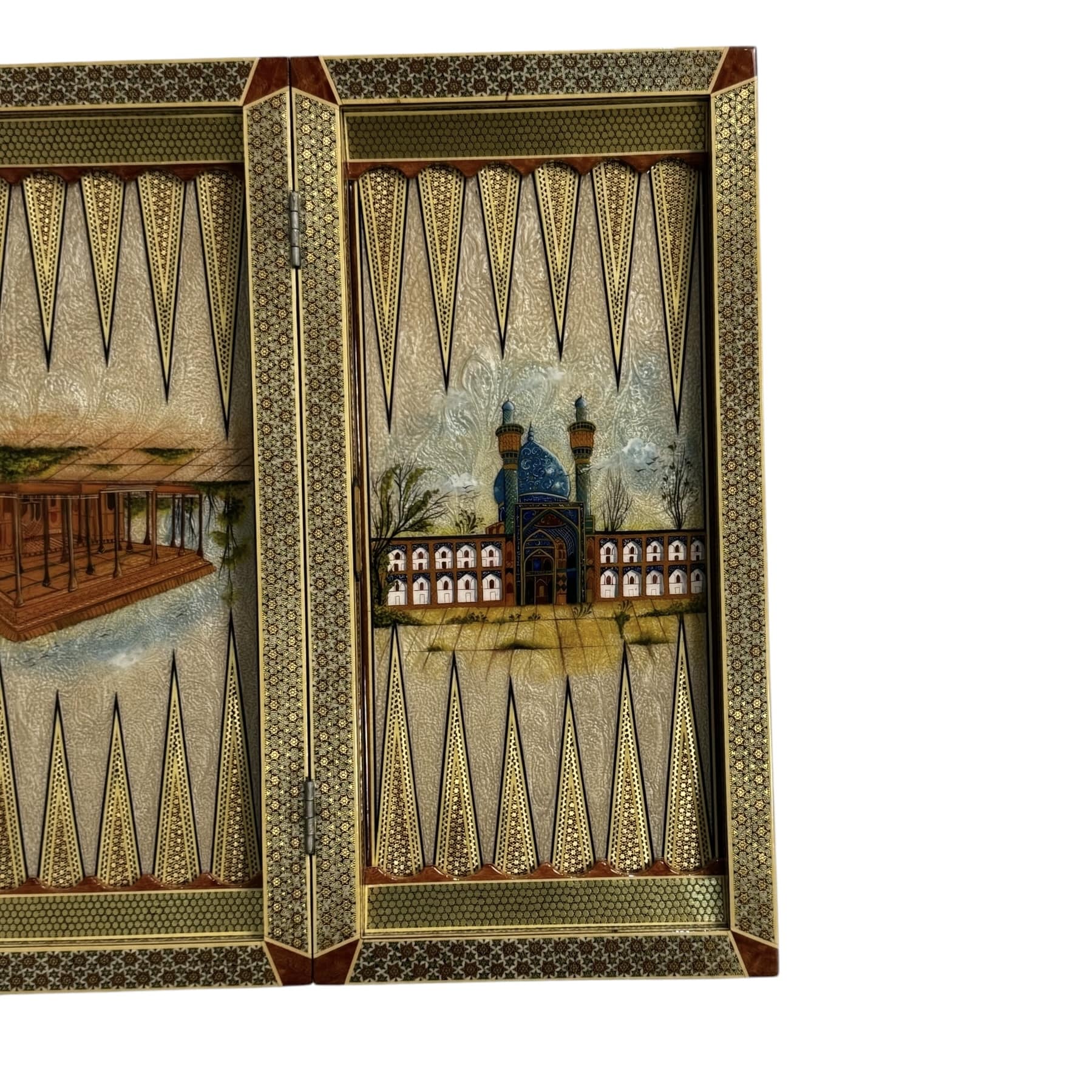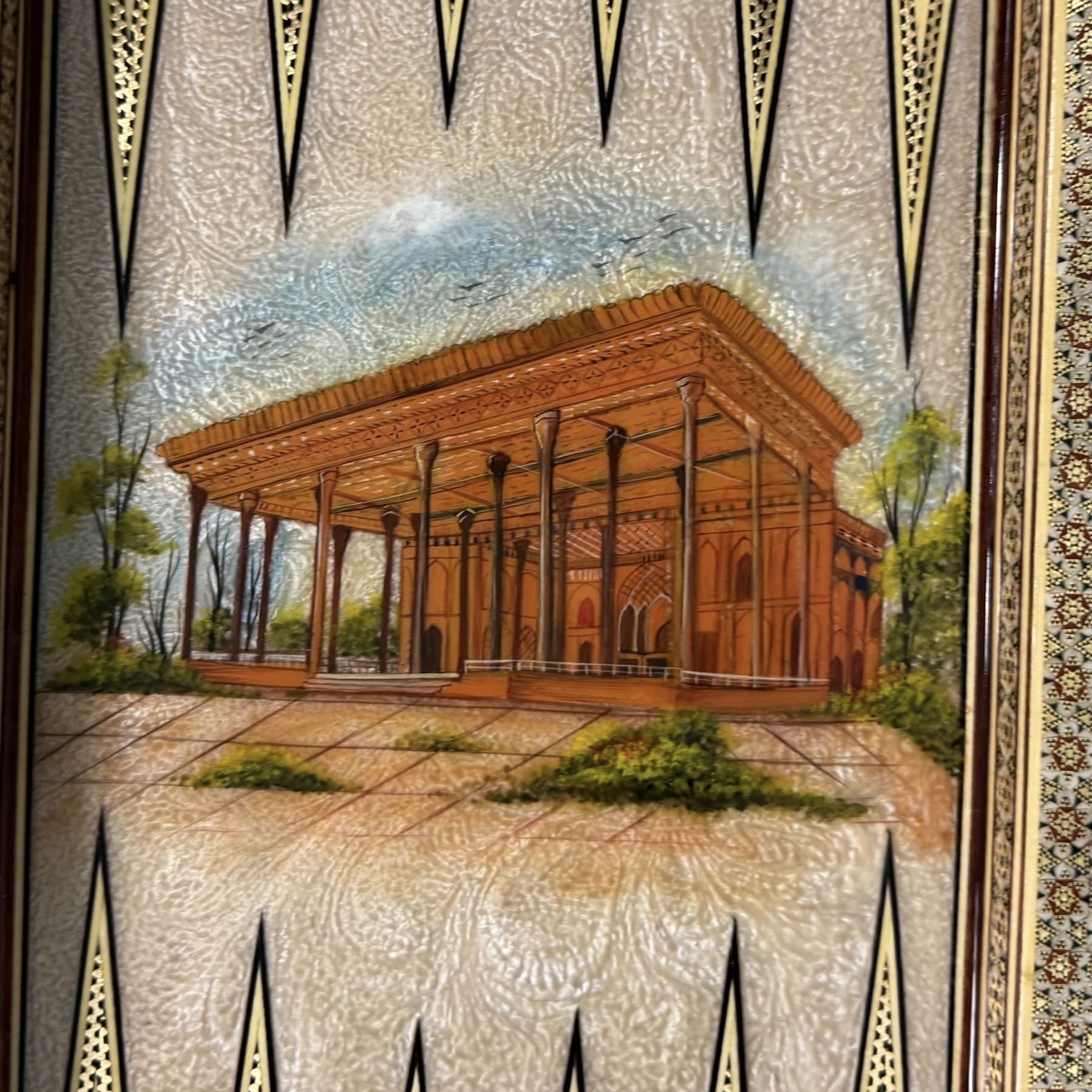- تخته نردها اغلب با تصاویری از نمادهای تاریخی و معماری ایرانی طراحی میشوند. در این نمونه، تصاویر کاخ چهلستون و یک بنای تاریخی دیگر طراحی شده است که حس و حال اصالت ایرانی را به نمایش میگذارد.