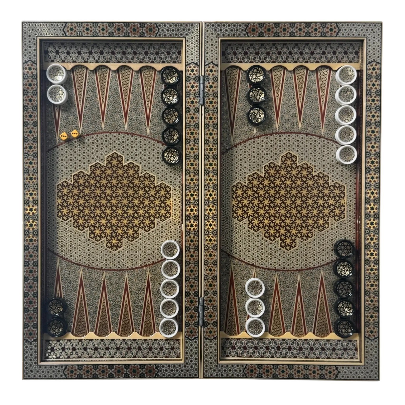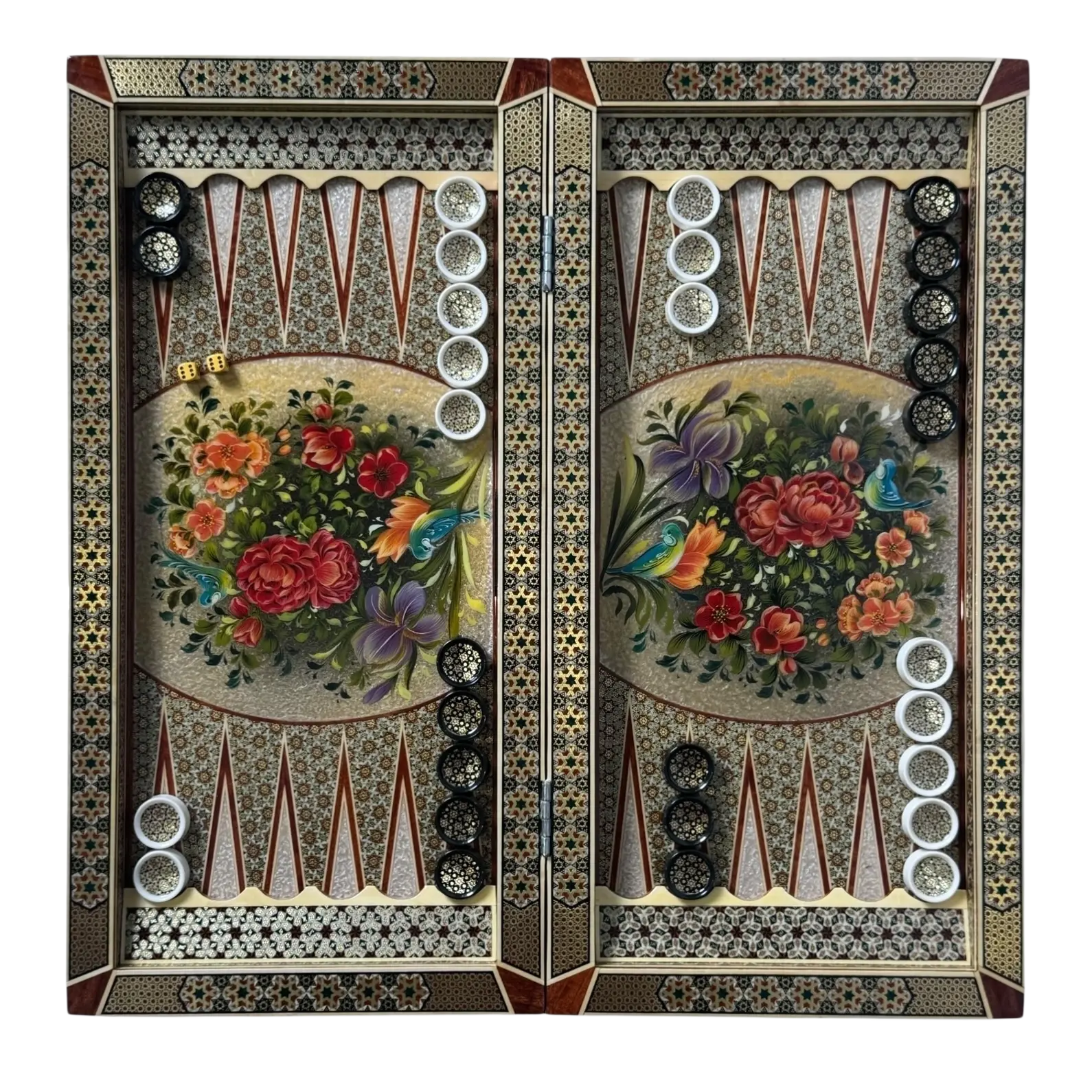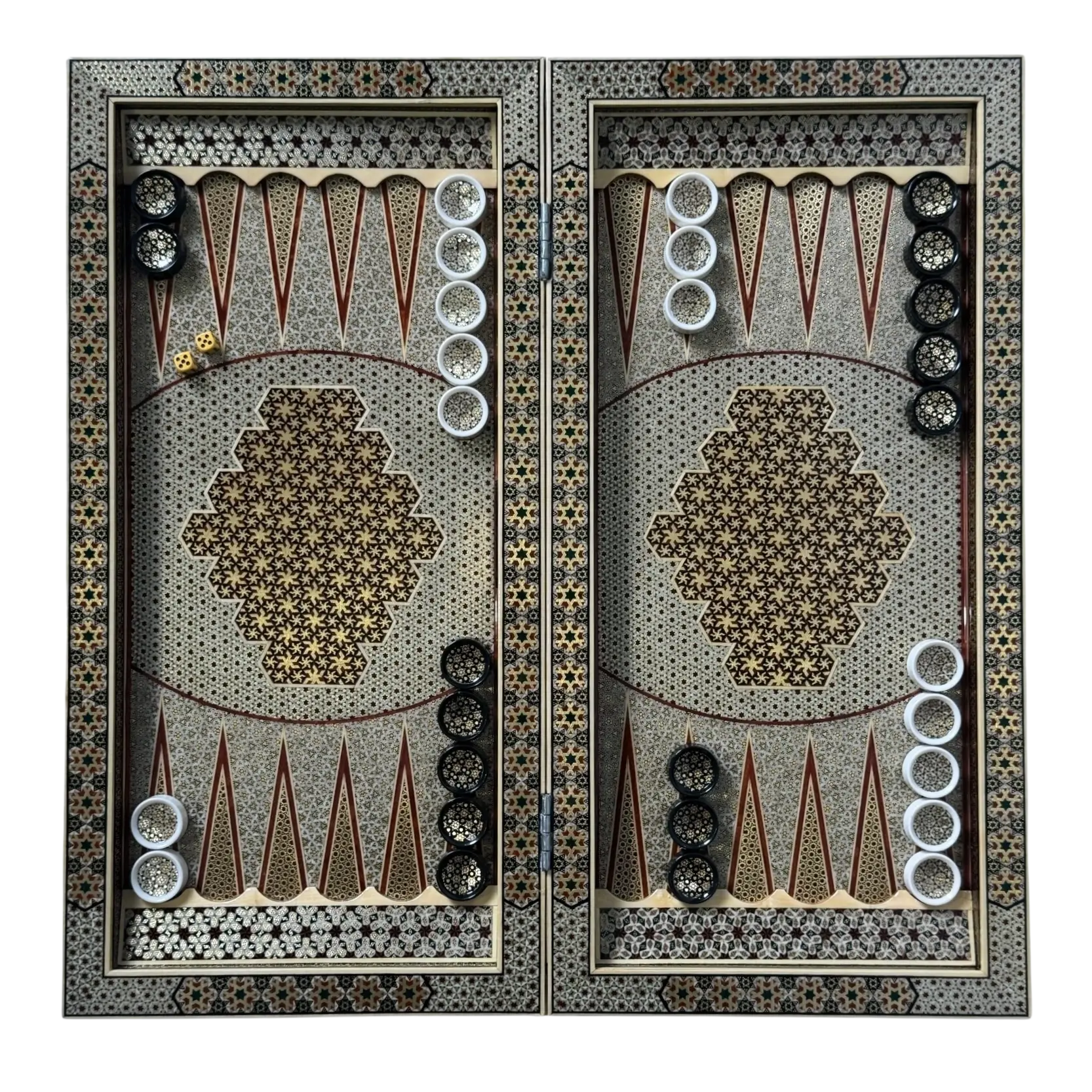 - حاشیههای تخته نرد با خاتمکاری تزئین شده است که شامل الگوهای هندسی بسیار دقیق و ظریف است. این هنر سنتی ایرانی از ترکیب چوب، استخوان، فلز و مواد طبیعی ساخته میشود، این نوع تزئینات دستی بوده و زمانبر است، که ارزش هنری تخته را افزایش میدهد.