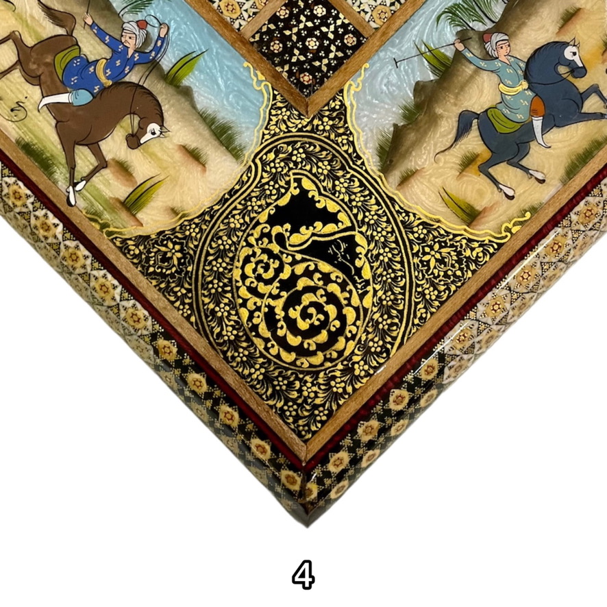 همانطور که در تصویر مشاهده می فرمایید ، از طرح زیبای بازی چوگان که یکی از بازی های اصیل و قدیمی ایرانیست در این تخته نرد استفاده کرده ایم .