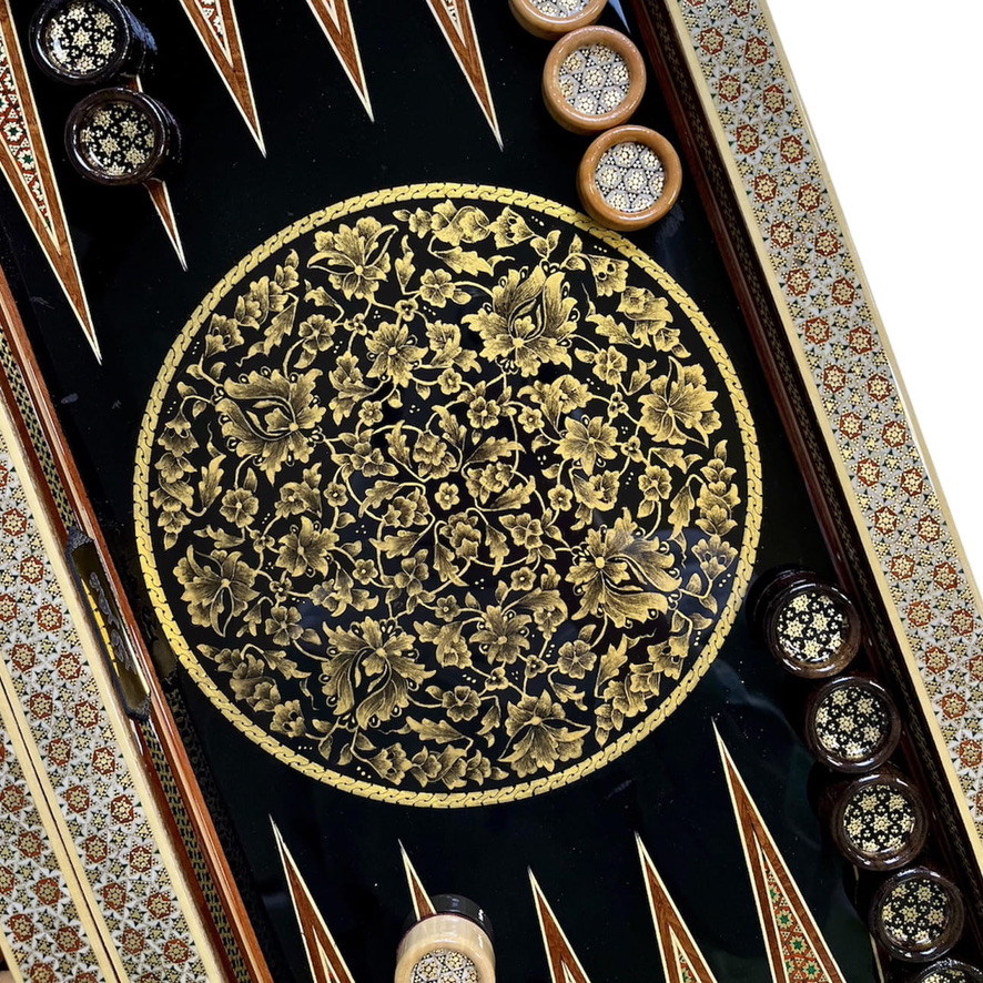 این تخته نرد از چوب بسیار مرغوب و با کیفیتی ساخته شده است و با استفاده از هنر خاتم به زیبایی تزئین شده است