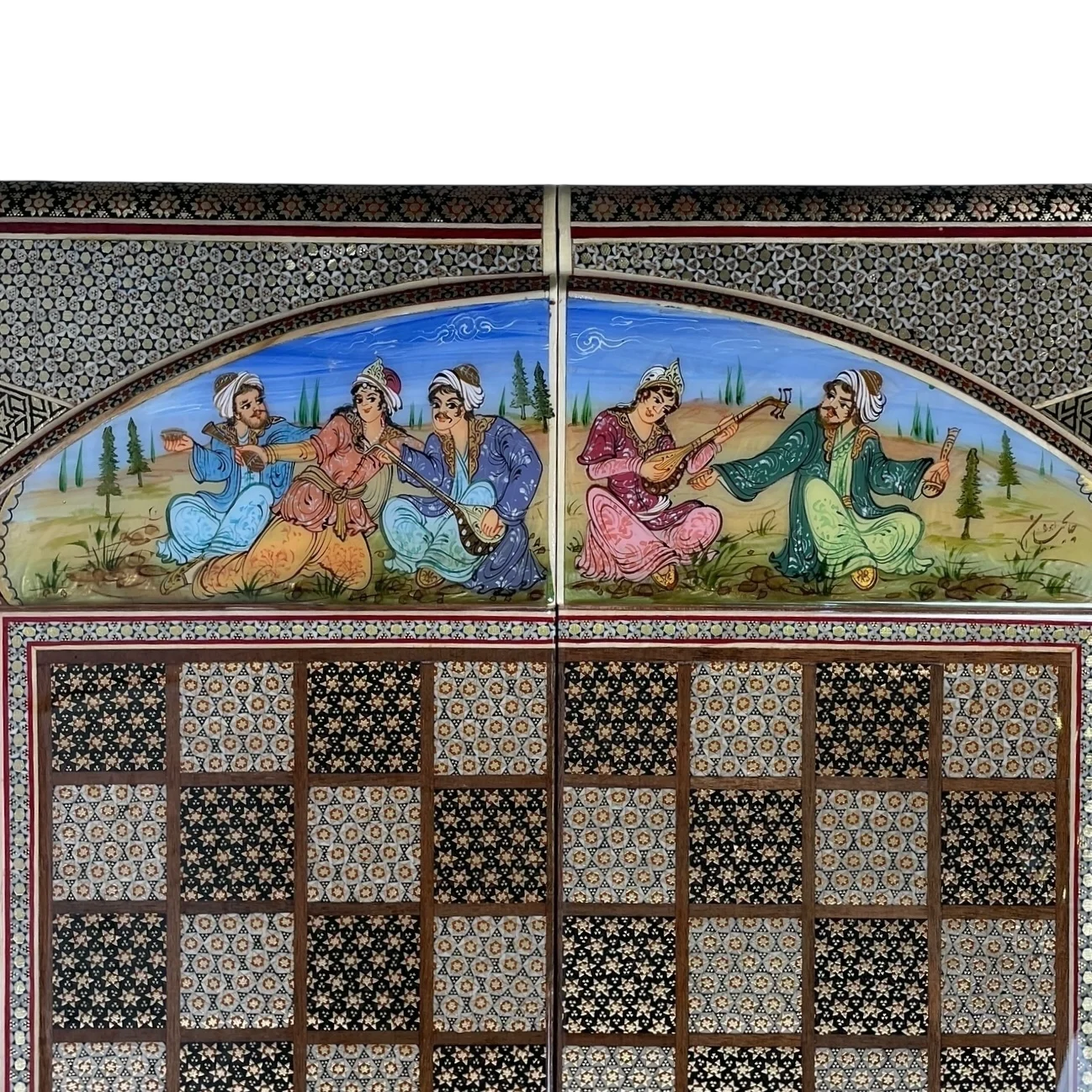 درون تخته، صحنهای زیبا و هنرمندانه از یک بزم موسیقی سنتی به تصویر کشیده شده است. در این نقاشی، مردی در حال نینوازی است و در کنار او زنی با ظرافت مشغول نواختن تنبک یا ساز کوبهای است. این صحنه با الهام از محافل موسیقی اصیل ایرانی طراحی شده که حال و هوای سنت و فرهنگ ایرانی را به زیبایی منتقل میکند. چهرهها، لباسها و فضای نقاشی همگی با جزئیات دقیق و رنگبندی چشمنواز کار شدهاند.