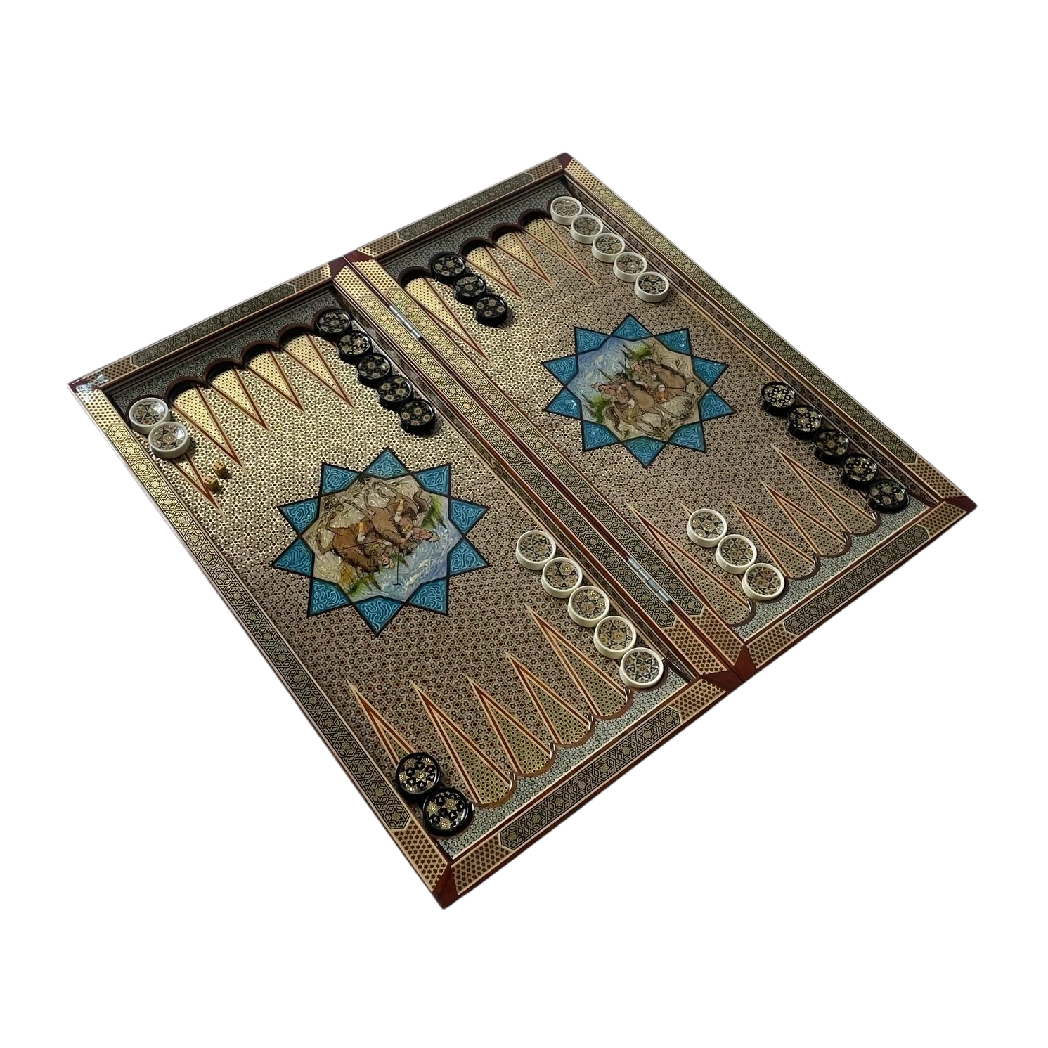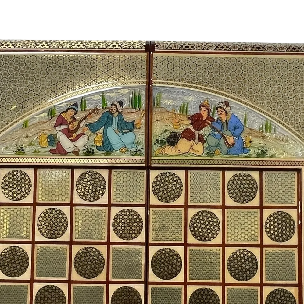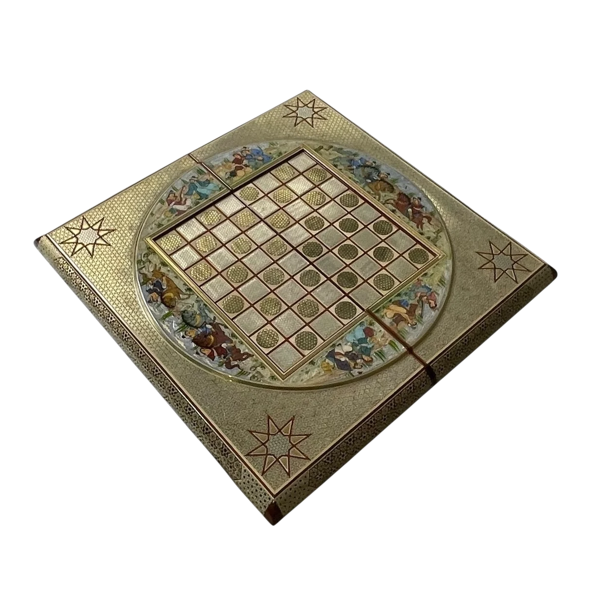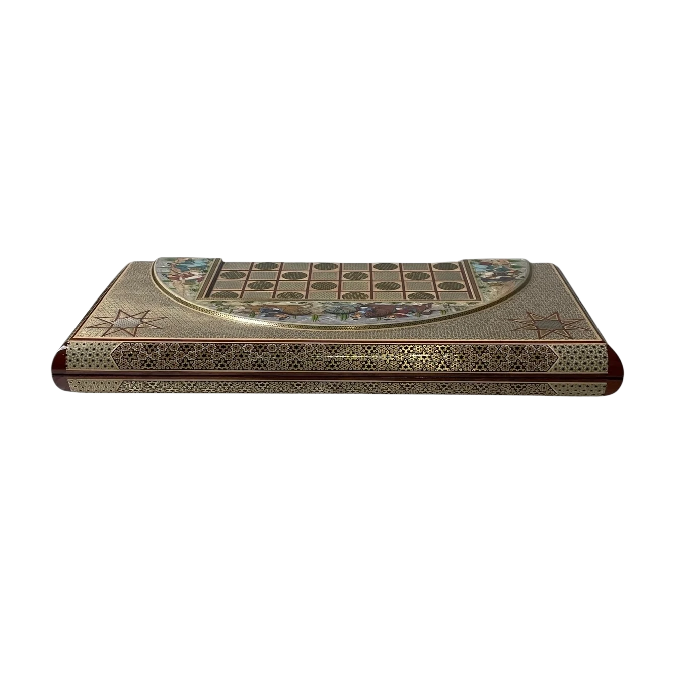 این تخته نرد ۶۰ سانتیمتری، اثری فاخر و اصیل از صنایعدستی ایرانی است که با بهرهگیری از هنر خاتمکاری و نقاشیهای سنتی، جلوهای چشمگیر و بینظیر پیدا کرده است. طراحی این تخته، نهتنها برای علاقهمندان به بازی تخته نرد و شطرنج، بلکه برای دوستداران هنر ایرانی و مجموعهداران ارزشمند است.