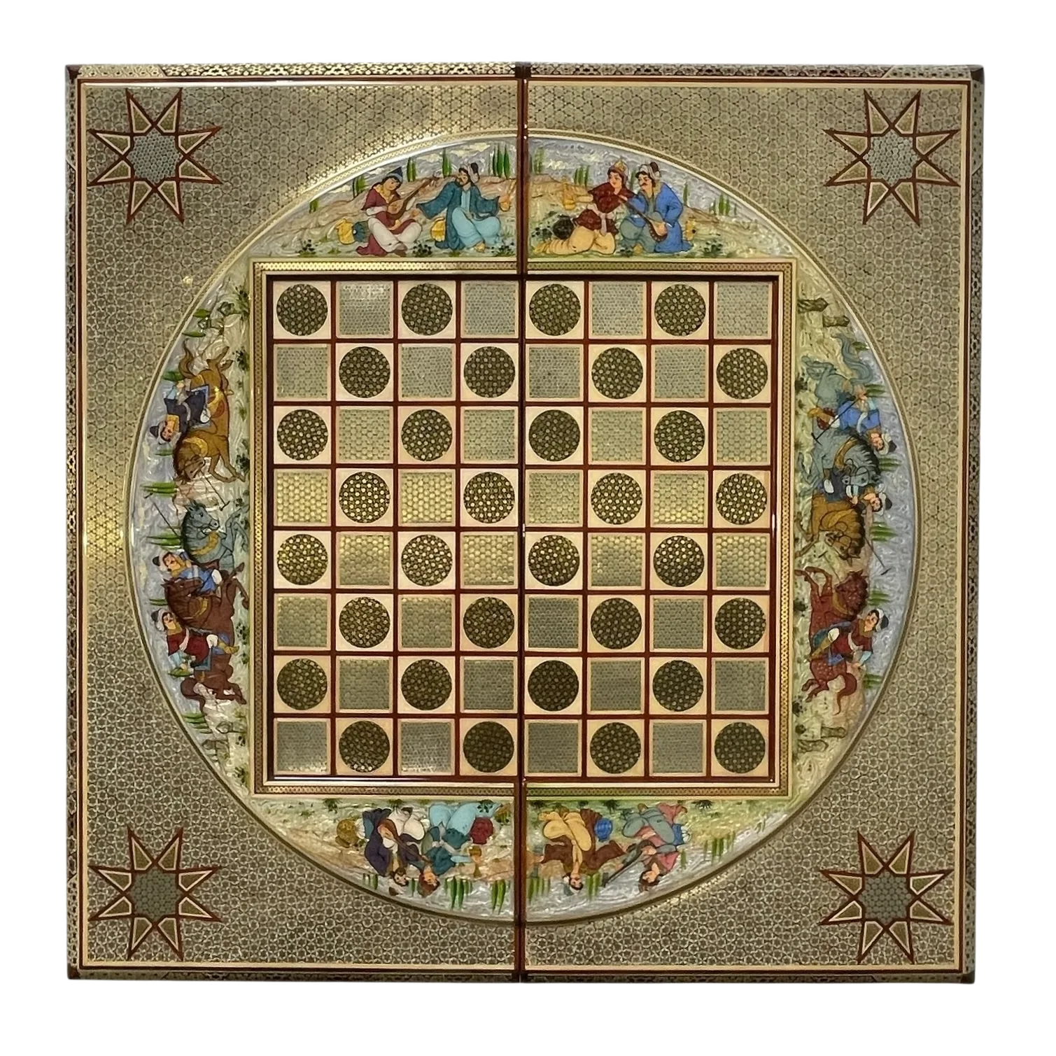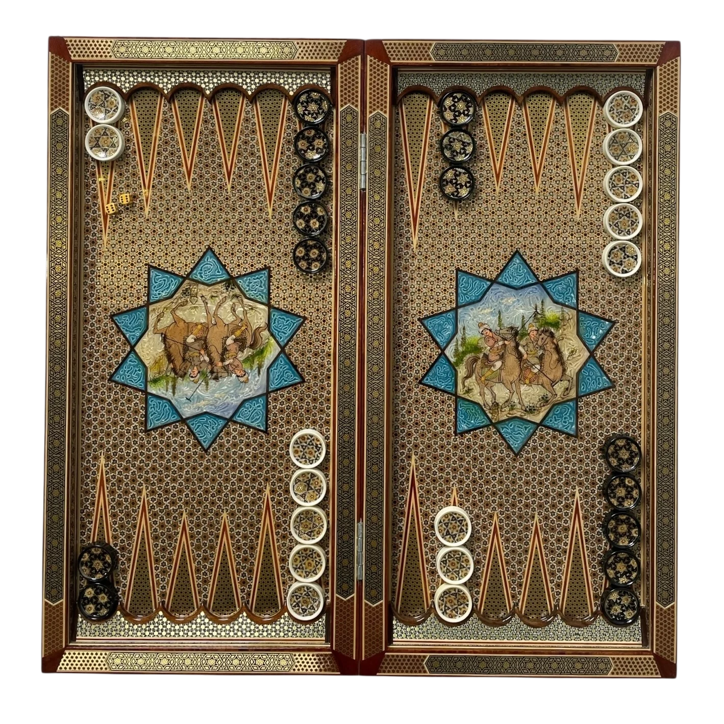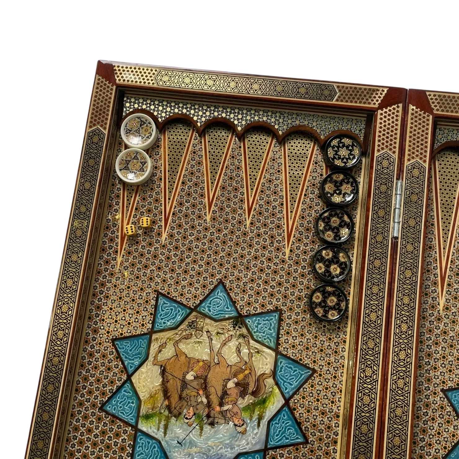 این تخته نرد ۶۰ سانتیمتری، اثری فاخر و اصیل از صنایعدستی ایرانی است که با بهرهگیری از هنر خاتمکاری و نقاشیهای سنتی، جلوهای چشمگیر و بینظیر پیدا کرده است. طراحی این تخته، نهتنها برای علاقهمندان به بازی تخته نرد و شطرنج، بلکه برای دوستداران هنر ایرانی و مجموعهداران ارزشمند است.