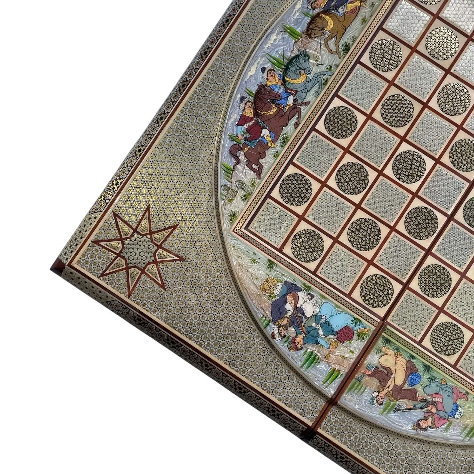 سطح شطرنج این تخته با دقت بالا خاتمکاری شده و کمی پایینتر از نقاشیهای پشت تخته قرار گرفته است. این اختلاف سطح باعث میشود نقاشیهای پشت تخته جلوهای برجستهتر و زیباتر پیدا کنند. ابعاد خانههای شطرنج کاملاً استاندارد است و برای انجام بازی شطرنج مناسب میباشد.