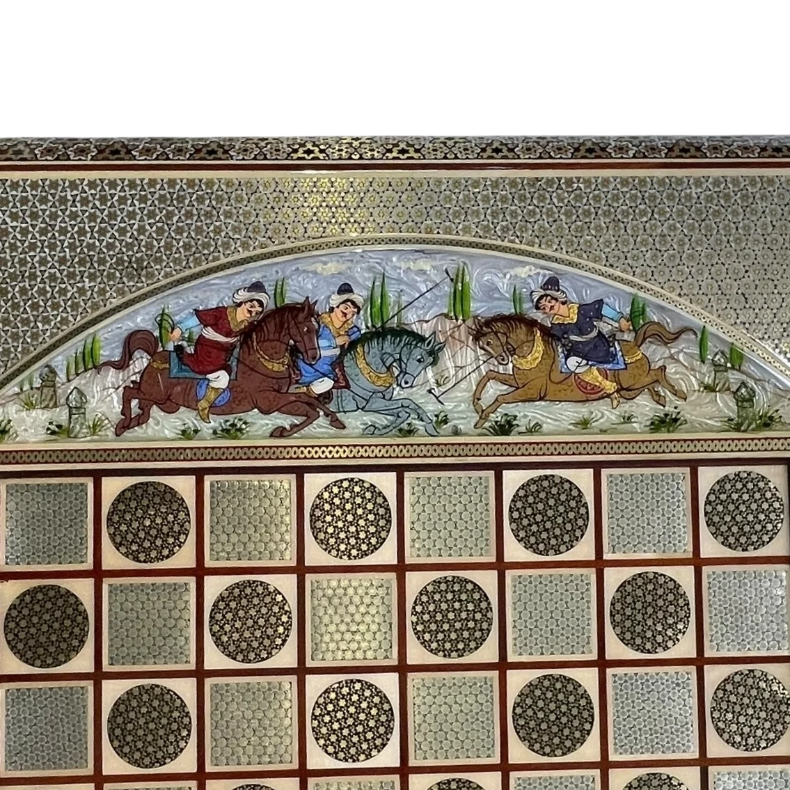 درون این تخته، از هر دو سمت، نقاشیهای بسیار زیبا و هنرمندانه از صحنههای بازی چوگان اجرا شده است. سوارکارانی چابک، اسبهایی قدرتمند و توپ چوگان در فضایی سرسبز و سرشار از حرکت و هیجان به تصویر کشیده شدهاند. این نقاشیها الهامگرفته از هنر اصیل ایرانی و روایتگر یکی از کهنترین بازیهای ایرانی یعنی چوگان هستند. طراحی چهرهها، اسبها، فضا و رنگبندی با ظرافت و جزئیات بالا کار شده که شکوه و زیبایی ویژهای به داخل تخته میبخشد.