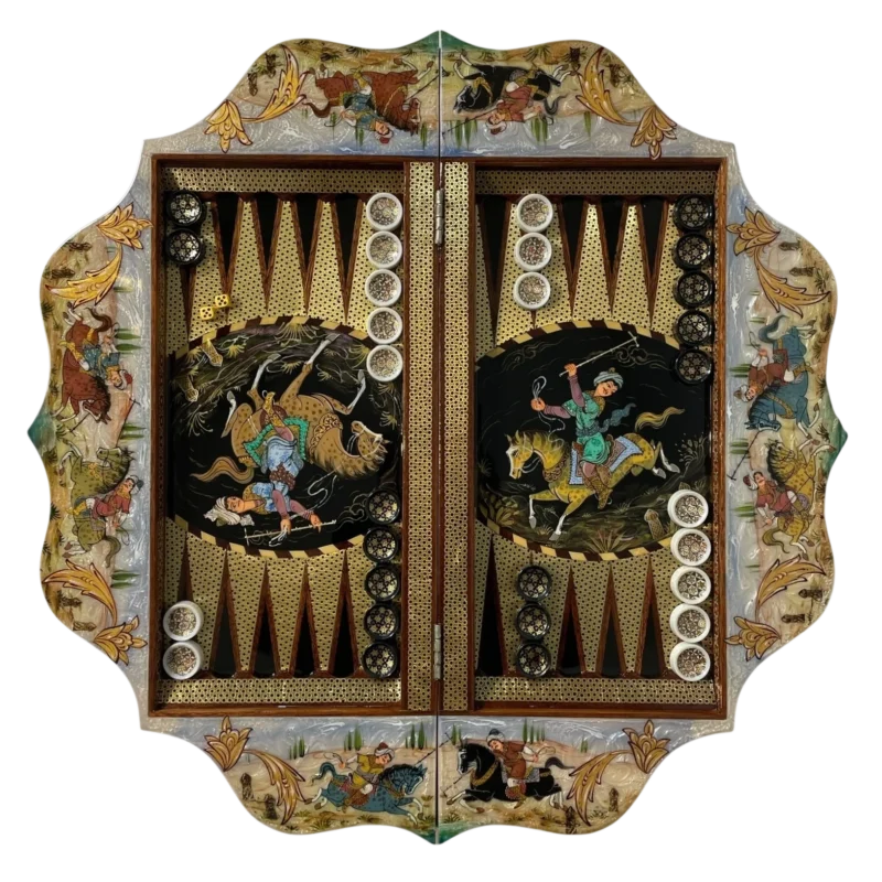 این تخته نرد خاتم کنگرهای با زمینه مشکی، جلوهای بینظیر از هنر ایرانی و فرهنگ غنی این سرزمین را به نمایش میگذارد. در داخل صفحه تخته نرد، نقش مرد و زن شزاب به دست به شکلی ظریف و هنرمندانه طراحی شده است و دور تا دور کلاف تخته، تصاویر چوگان و زن شراب به دست به زیبایی نقش بستهاند که بیانگر جشن، شادی و هنر زندگی ایرانی هستند.