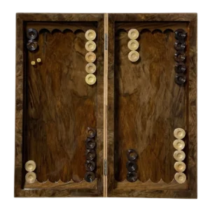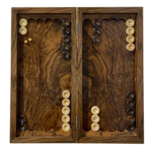 داخل تخته نرد از ریشه گردو به صورت قرینه استفاده شده و رگههای طبیعی چوب، ظاهر صفحه رو چشمگیرتر و خاصتر کرده است.
