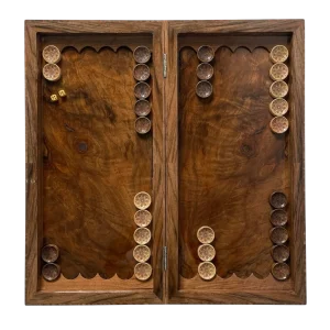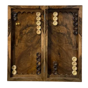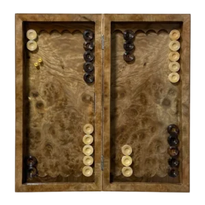 داخل تخته نرد از ریشه گردو به صورت قرینه استفاده شده و رگههای طبیعی چوب، ظاهر صفحه رو چشمگیرتر و خاصتر کرده است.