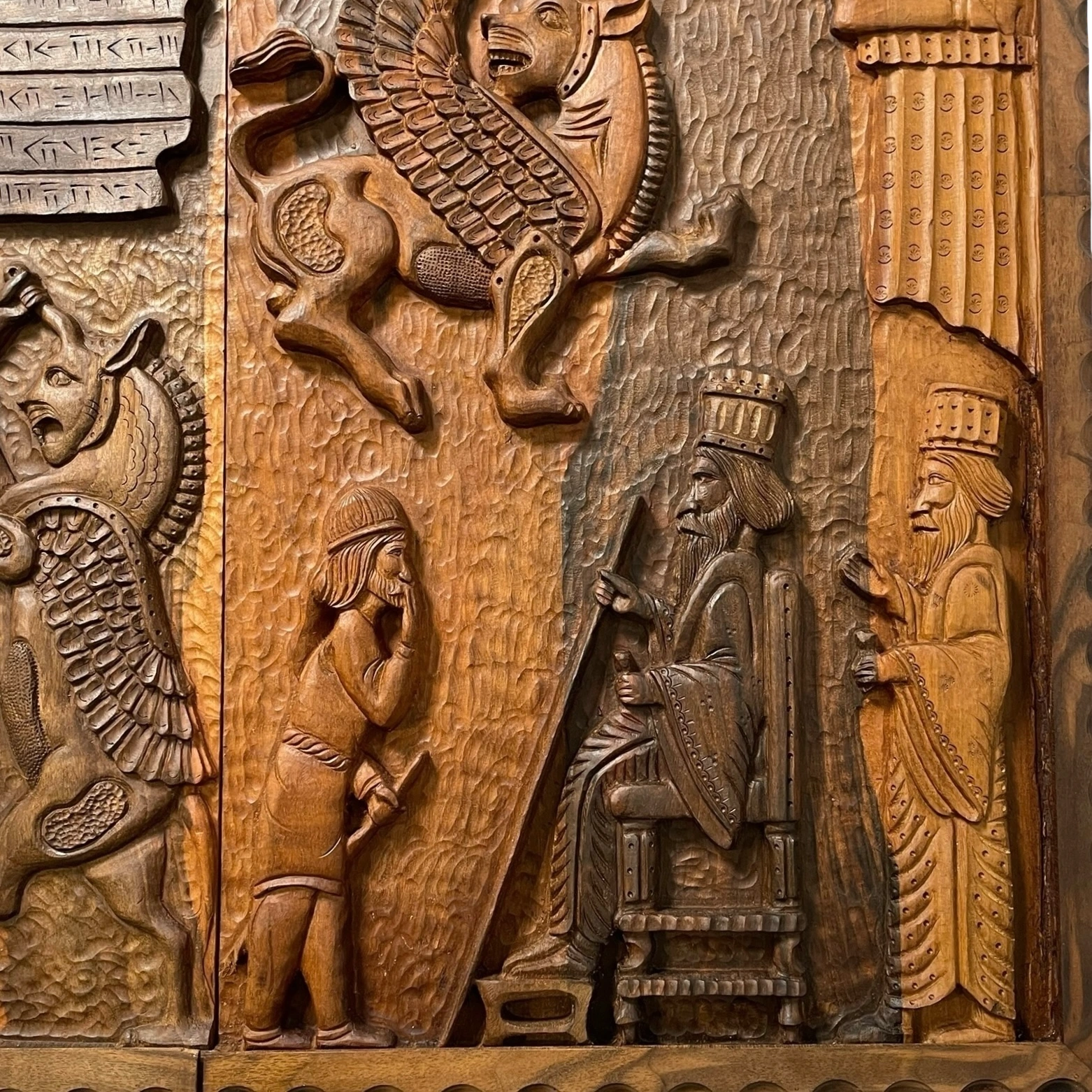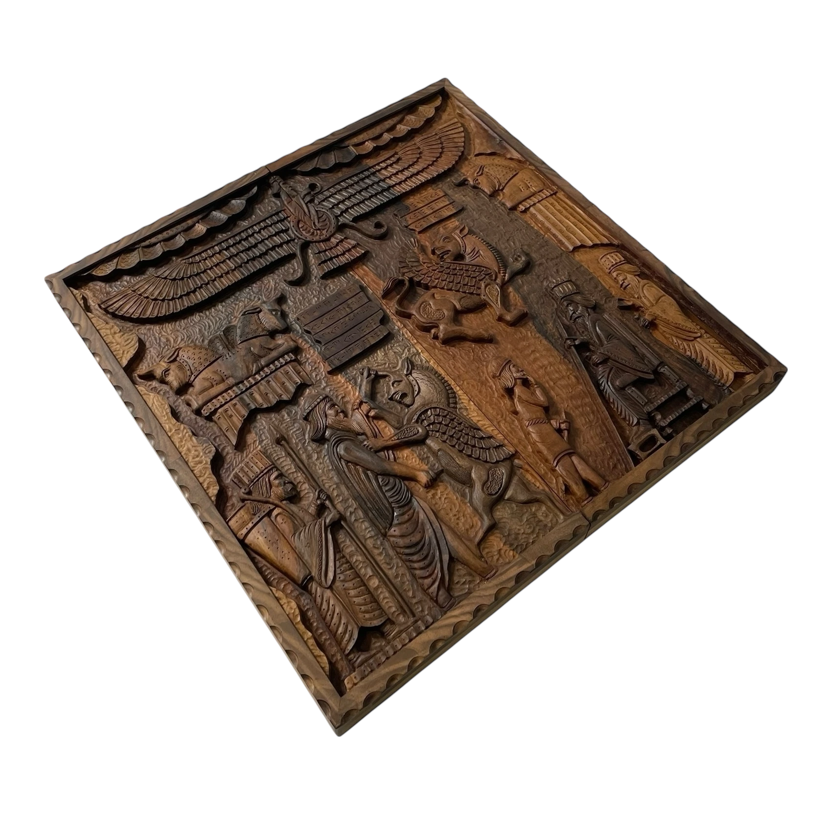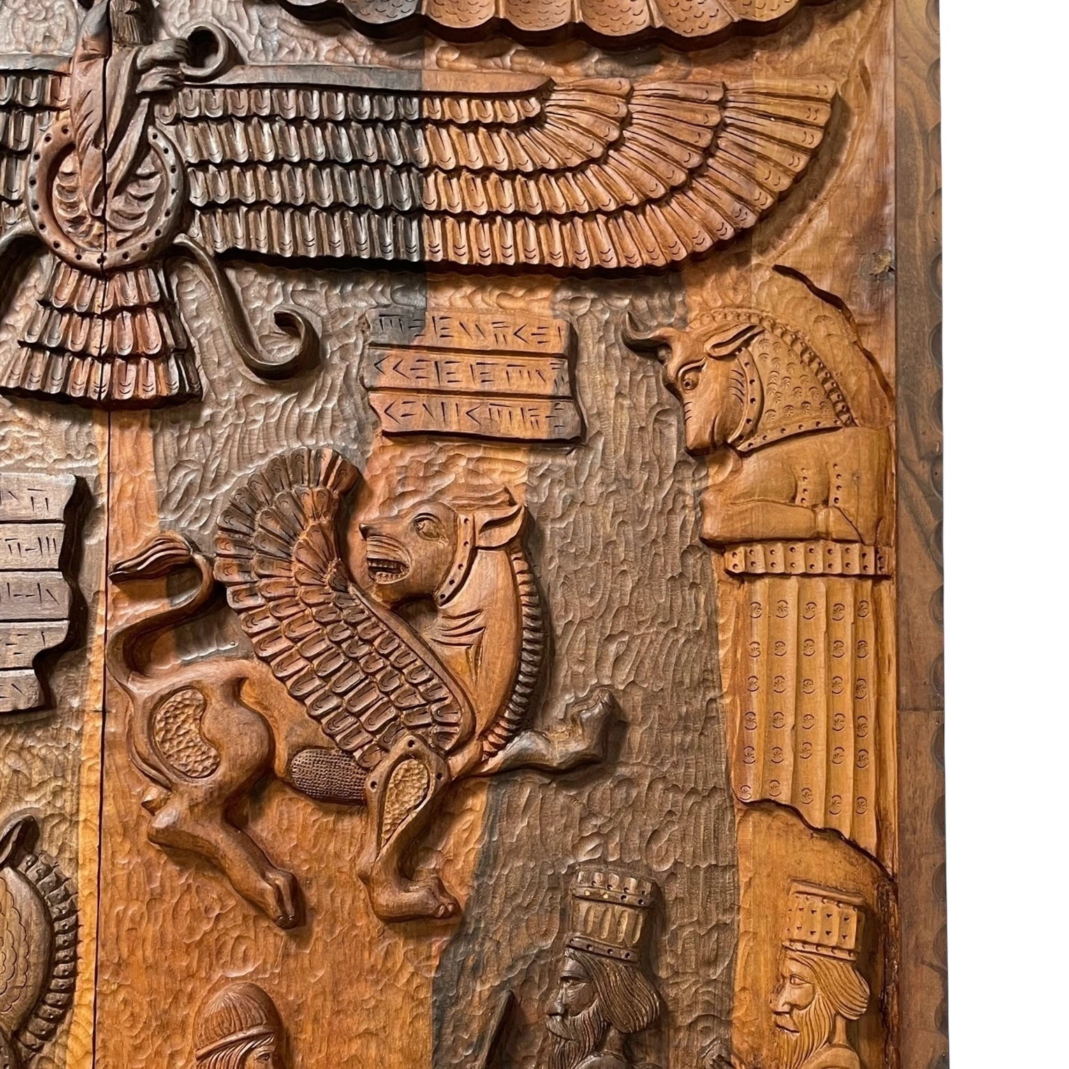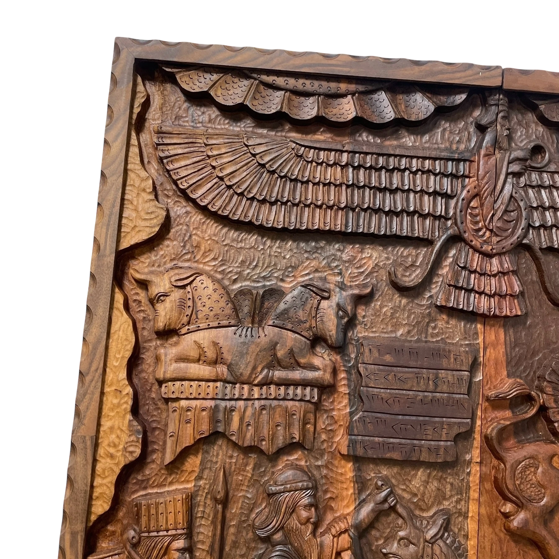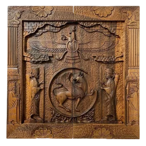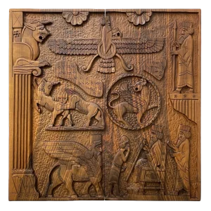 این صفحه منبت با الهام از شکوه هخامنشیان ساخته شده و شامل سرستون‌های اصیل پرسپولیس، سربازهای هخامنشی با پوشش رسمی، نماد فروهر، مهر کوروش و کتیبه کوروش است. همه‌ی عناصر با عمق زیاد و ظرافت فوق‌العاده منبت شده‌اند و ترکیب آنها این اثر را به یک صفحه هنری فاخر، تاریخی و چشمگیر تبدیل کرده است.