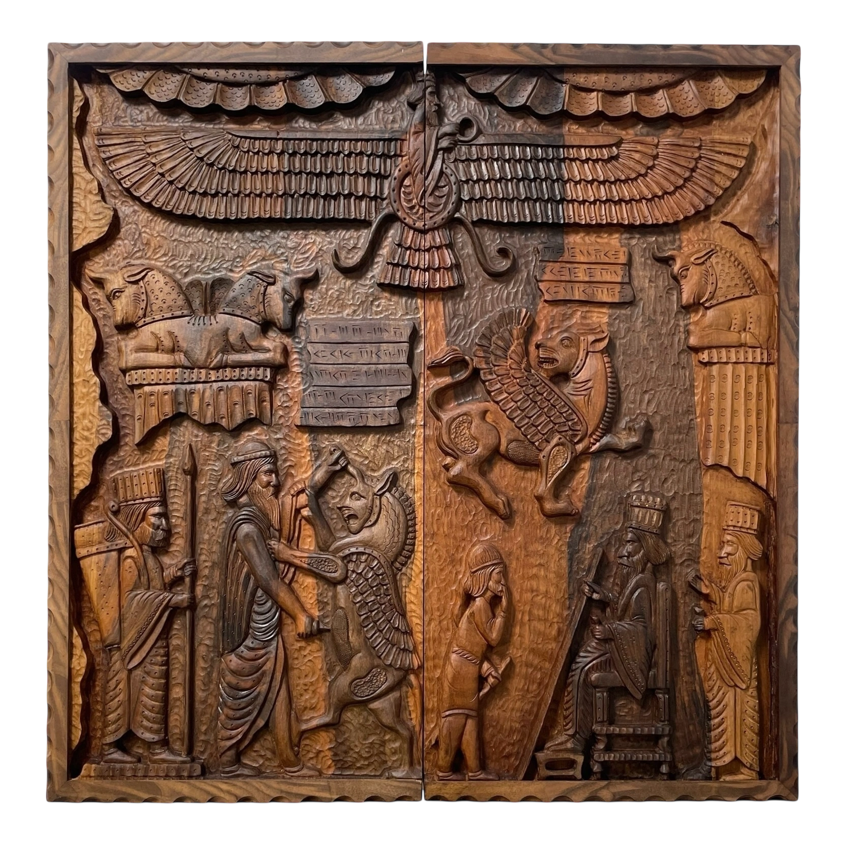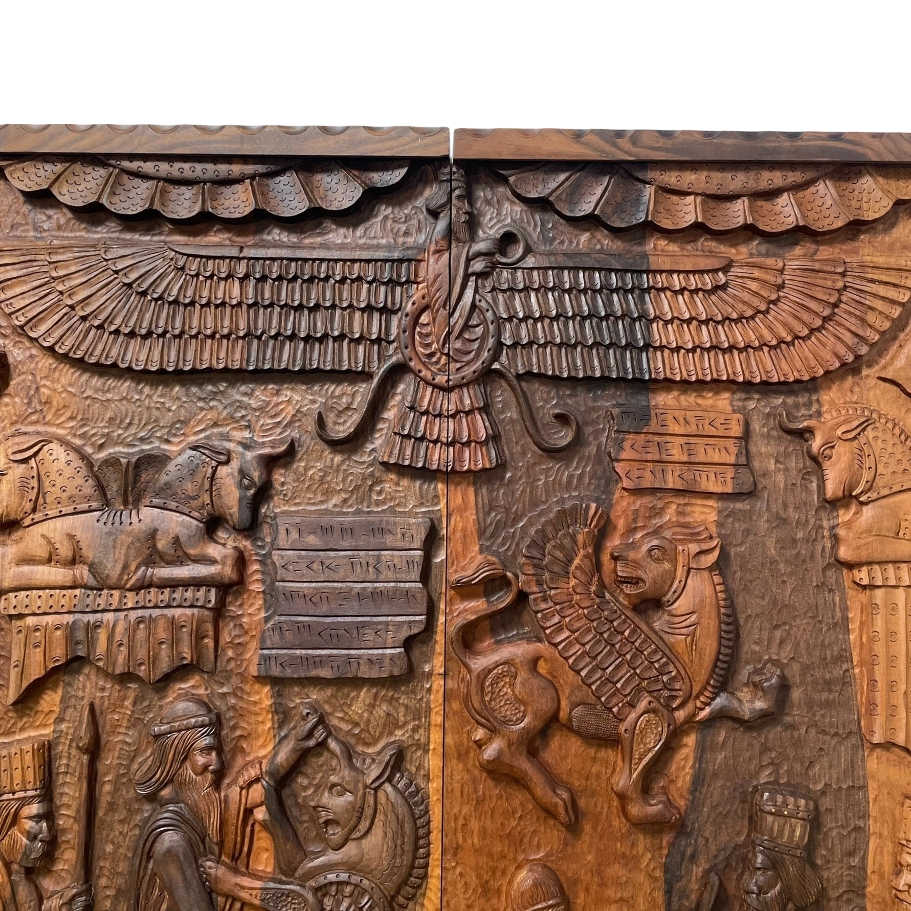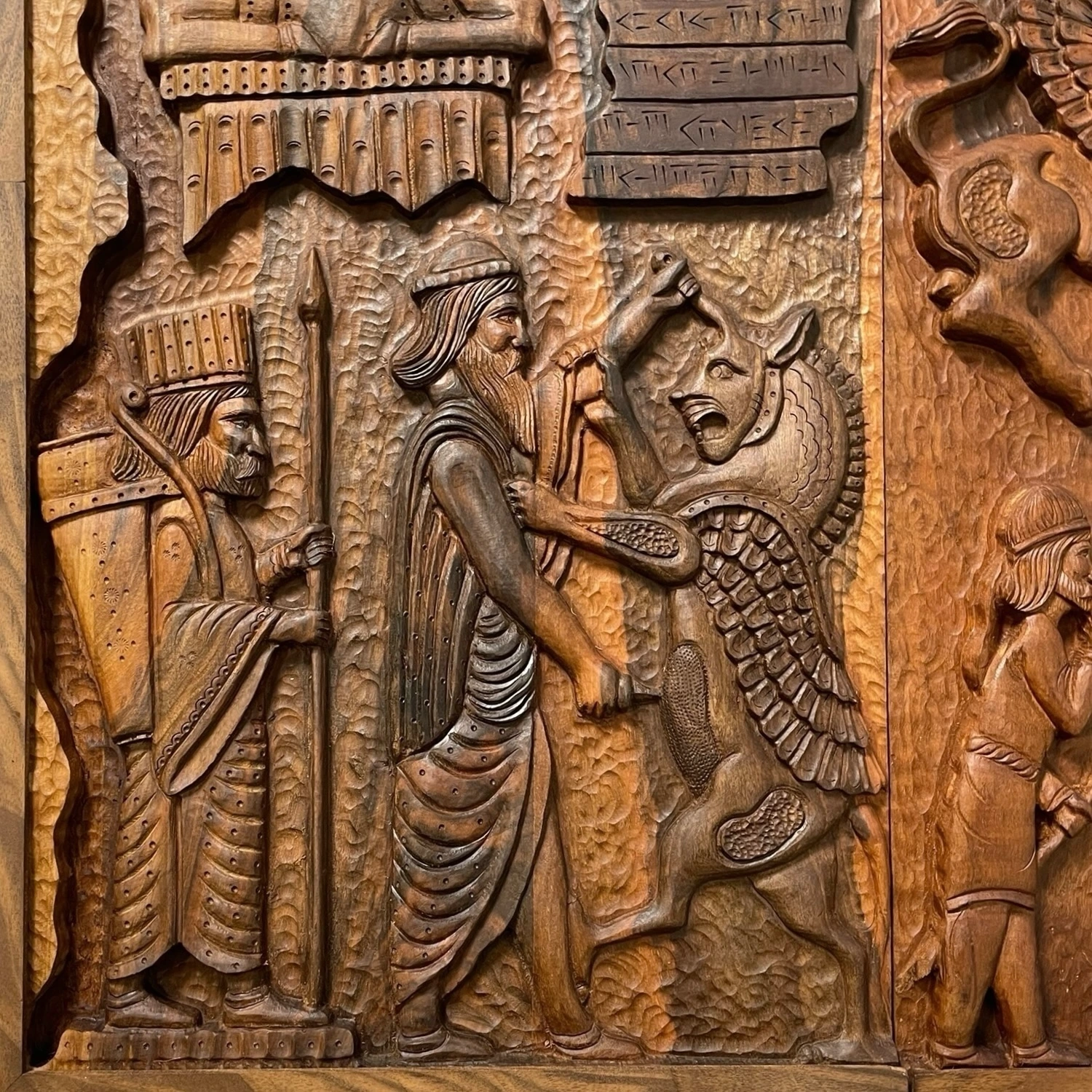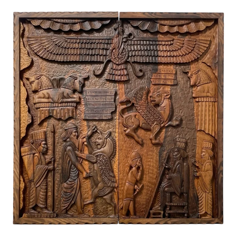 این صفحه منبت با الهام از شکوه هخامنشیان ساخته شده و شامل سرستون‌های اصیل پرسپولیس، سربازهای هخامنشی با پوشش رسمی، نماد فروهر، مهر کوروش و کتیبه کوروش است. همه‌ی عناصر با عمق زیاد و ظرافت فوق‌العاده منبت شده‌اند و ترکیب آنها این اثر را به یک صفحه هنری فاخر، تاریخی و چشمگیر تبدیل کرده است.
