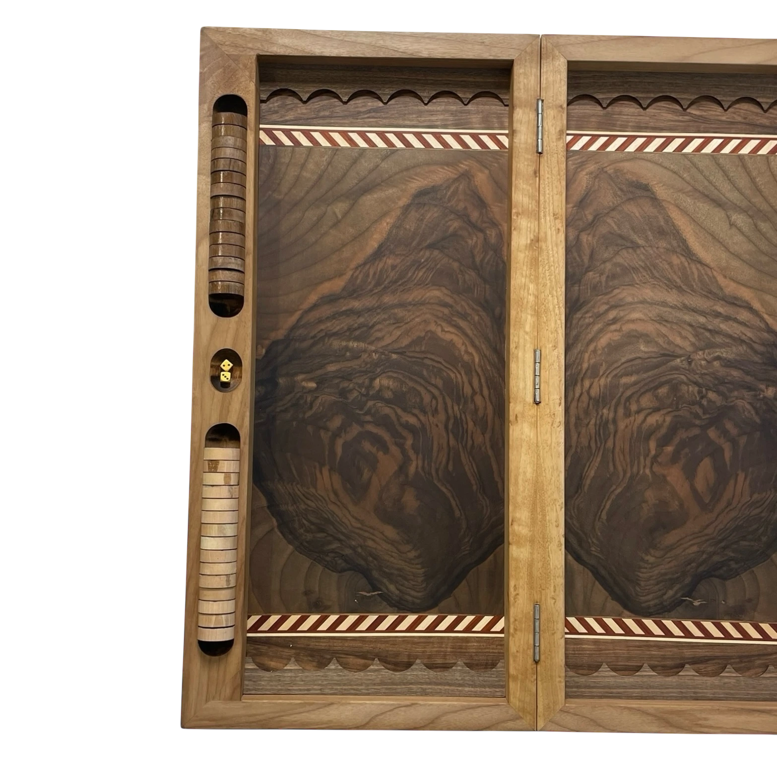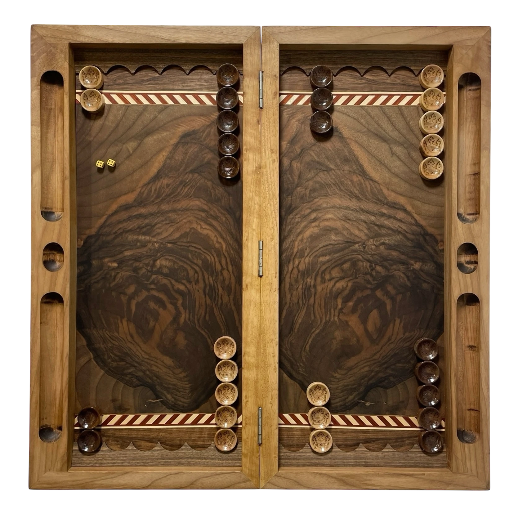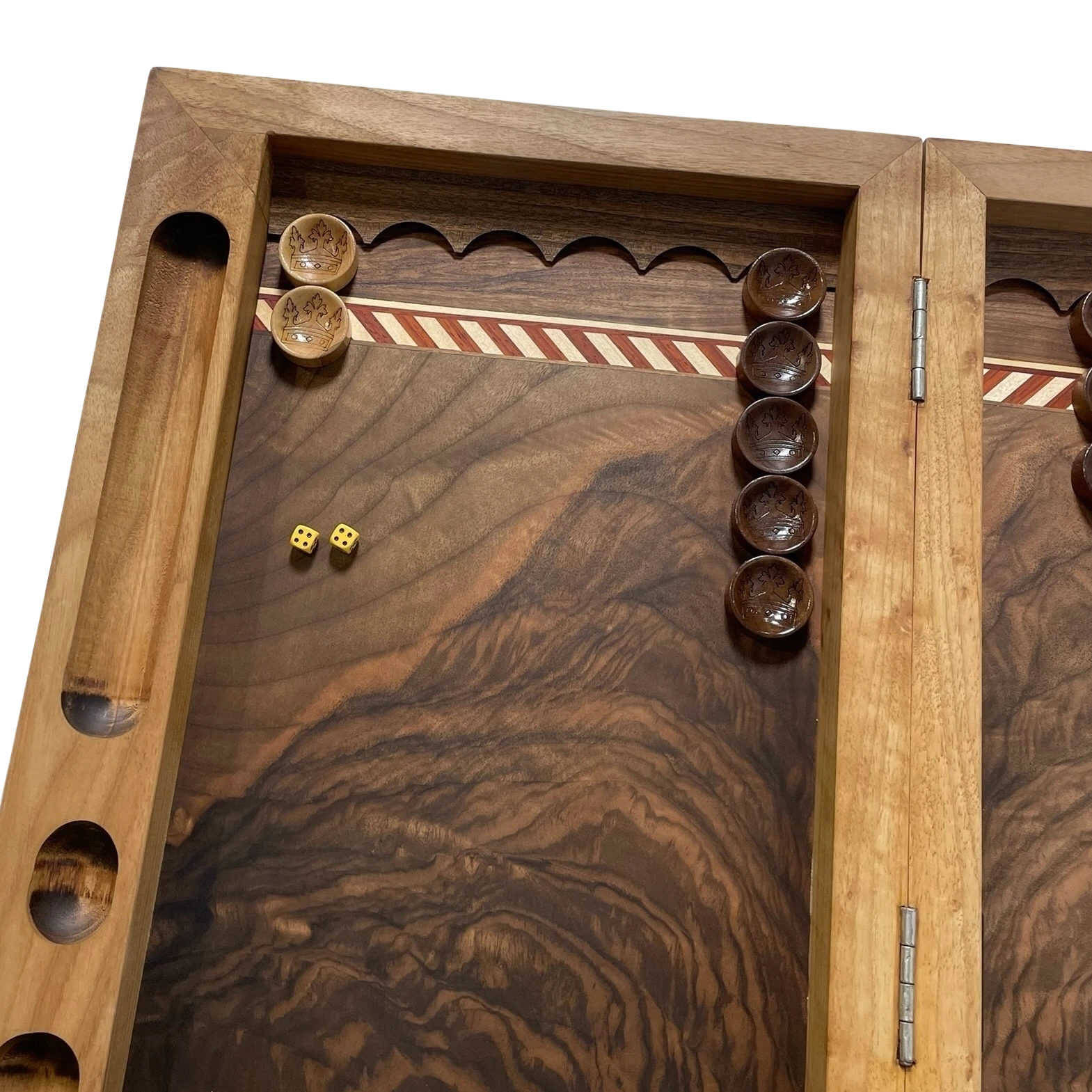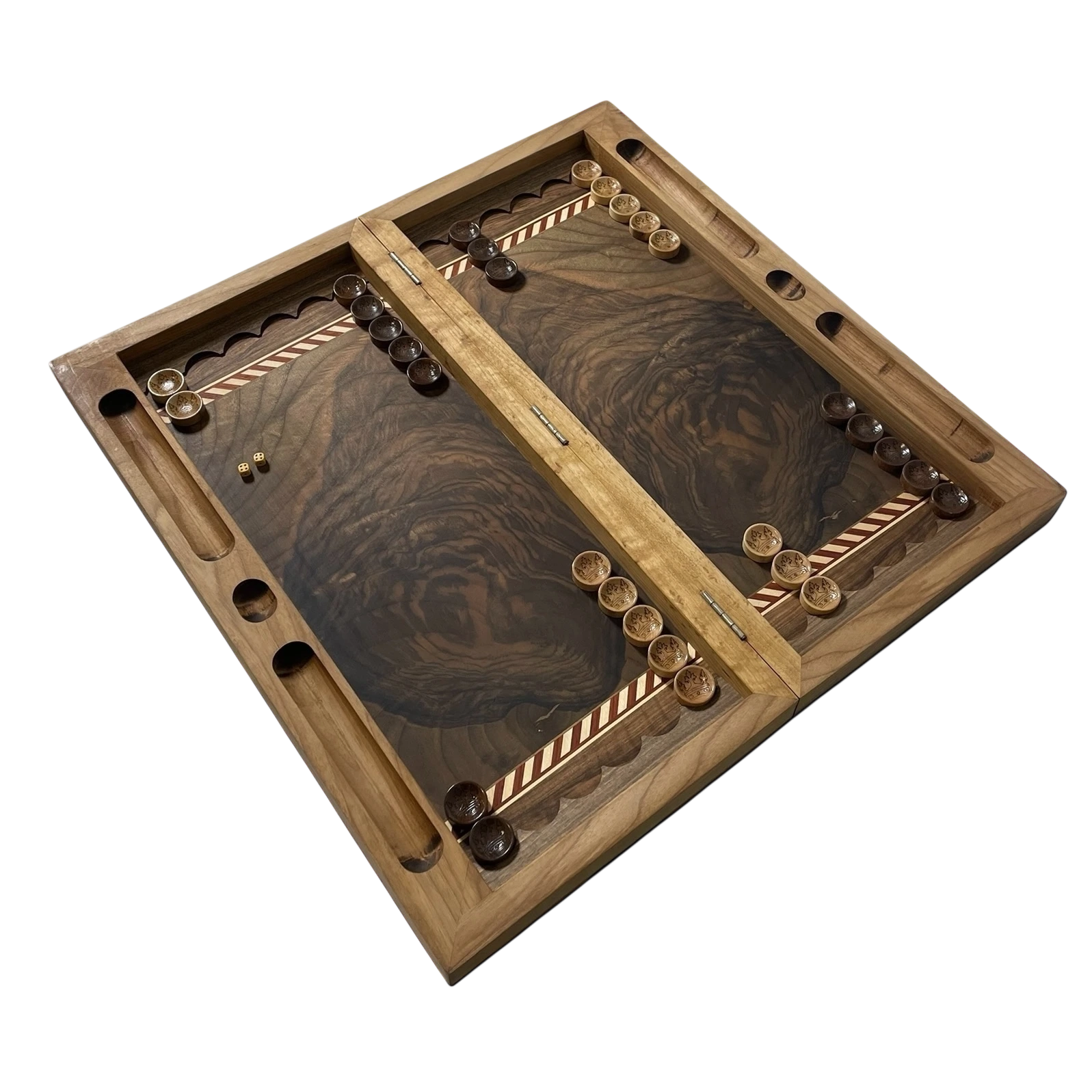 این محصول از چوب گردو ساخته شده و دارای دو لولای آلمانی درجه‌یک و مخفی است که باز و بسته شدن آن را روان و بی‌صدا می‌کند. تخته نرد با روغن هاردواکس پوشش داده شده تا زیبایی طبیعی چوب حفظ شده و دوام تخته افزایش یابد. دور تا دور تخته نرد به شکل سه‌ضلعی منبت شده با طرح سرباز هخامنشی طراحی شده که جلوه‌ای هنری و چشم‌نواز به تخته بخشیده است.