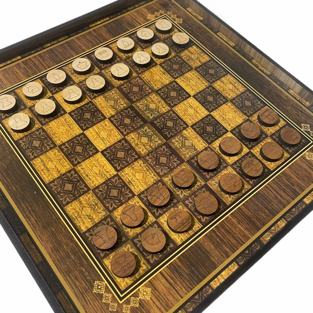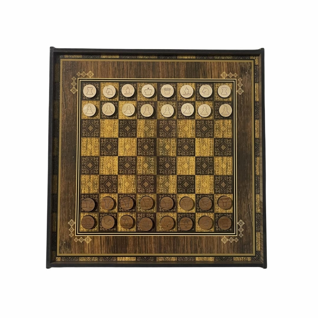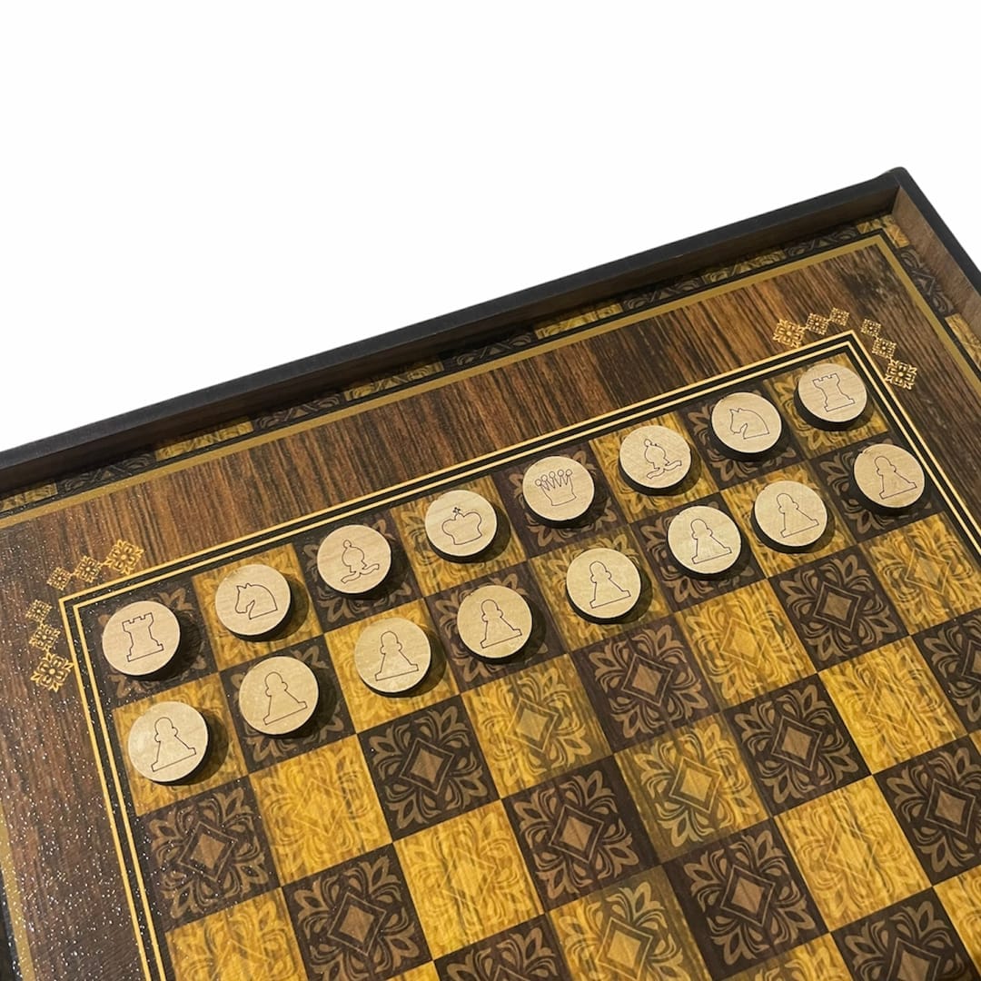مهره ها از جنس ام دی اف که 32مهره شطرنج و32 مهره تخته نرد دارد