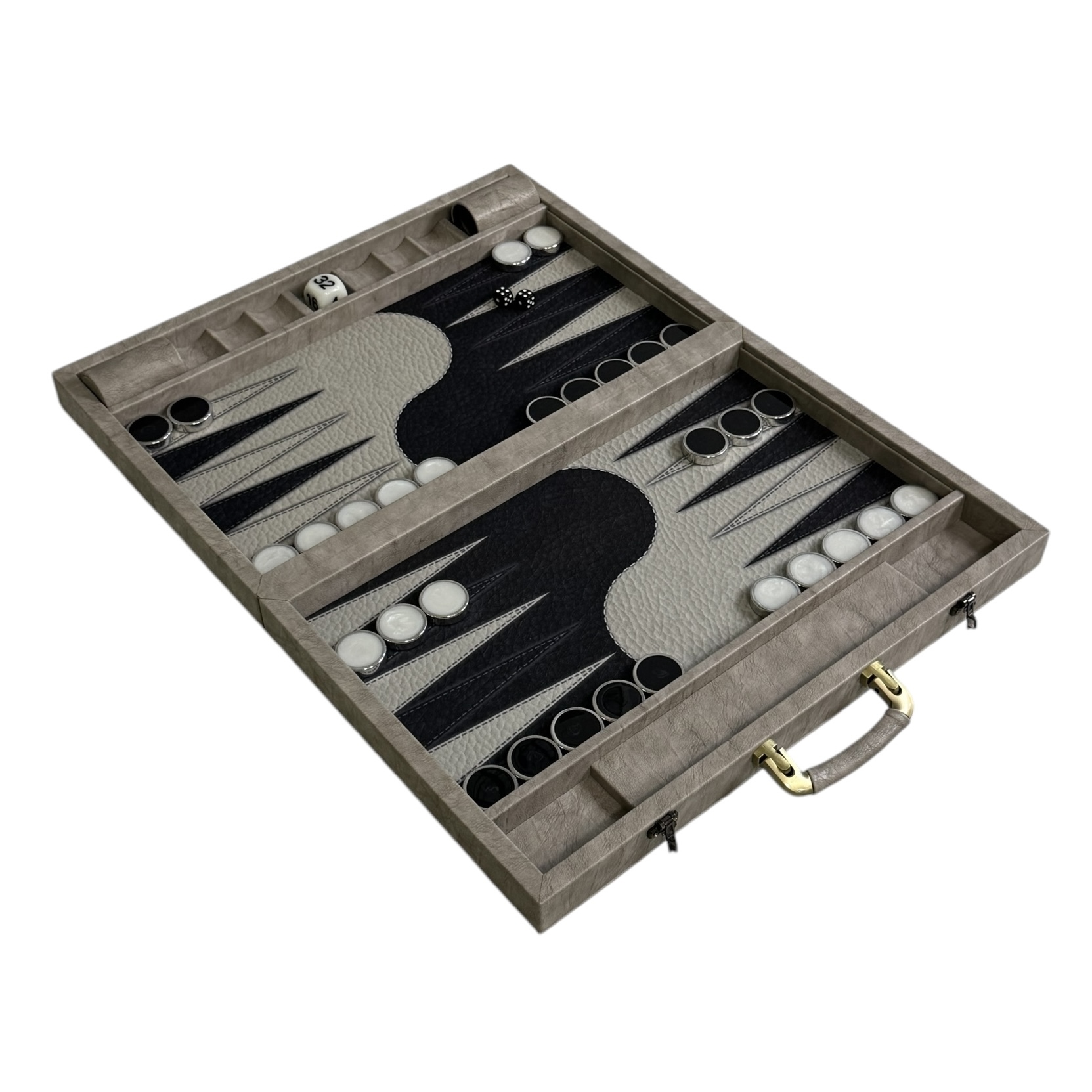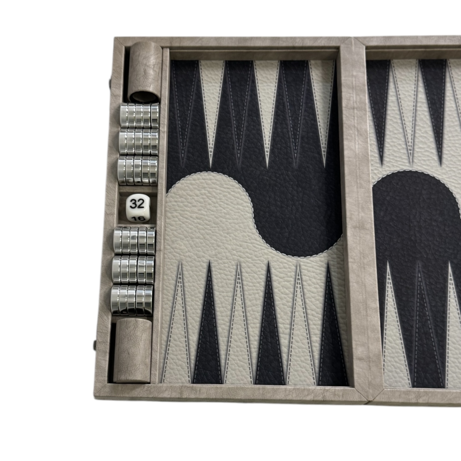 این تخته نرد مدرن از چرم صنعتی درجه‌یک تهیه شده است؛ جنسی مقاوم، با دوام بالا که نه ترک برمی‌دارد و نه پوسته می‌شود. ساختار یکپارچه و طراحی مهندسی‌شده، ظاهری جذاب و حرفه‌ای به آن بخشیده است.