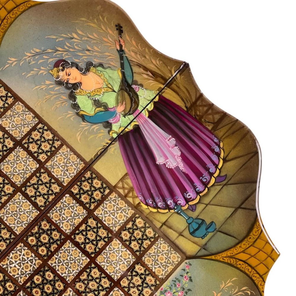 هنرمندان خاتم کار به بهترین نحو به این تخته نرد شکلی دل پذیر و چشم نواز با رنگ بندی متنوع و زیبا هدیه داده اند